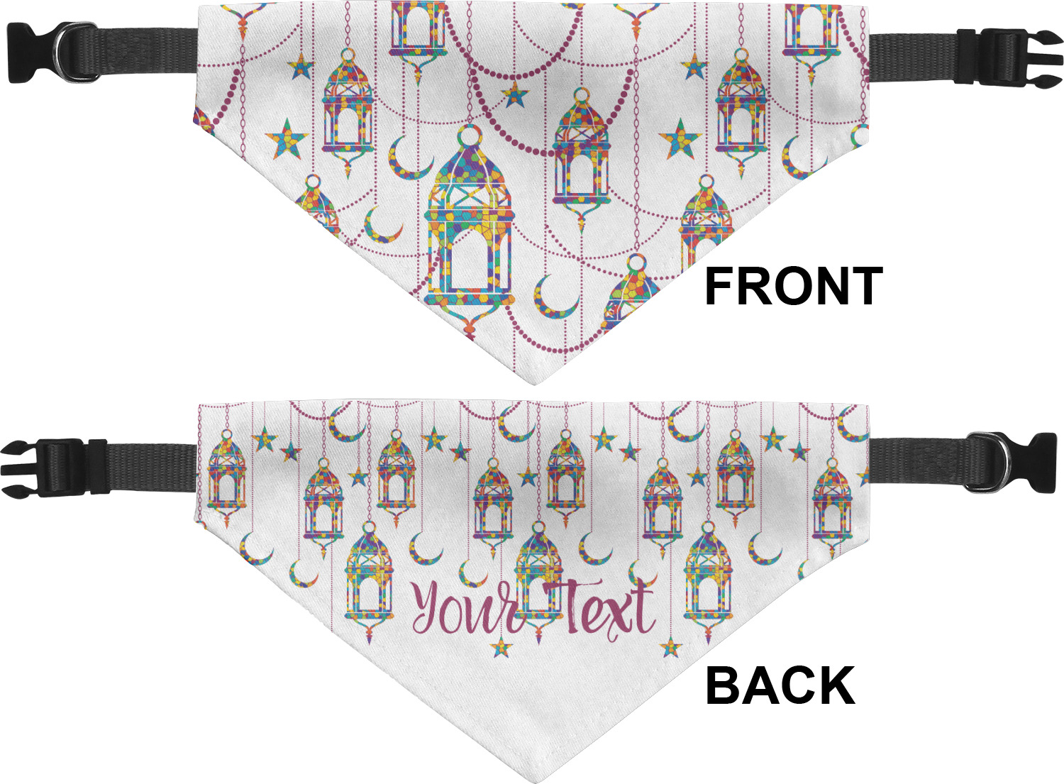 We print the front and back of these dog bandanas with your customized design. The bandana itself is made from a durable polyester, sewn together with a gap large enough to accommodate any collar. Regardless, the bandana includes a plain black, canvas collar with plastic snaps, that can easily be removed if desired. These dog bandana collars are available in four sizes: small, medium, large, and extra large. Please see our sizing chart for more information regarding the dimensions of each size.