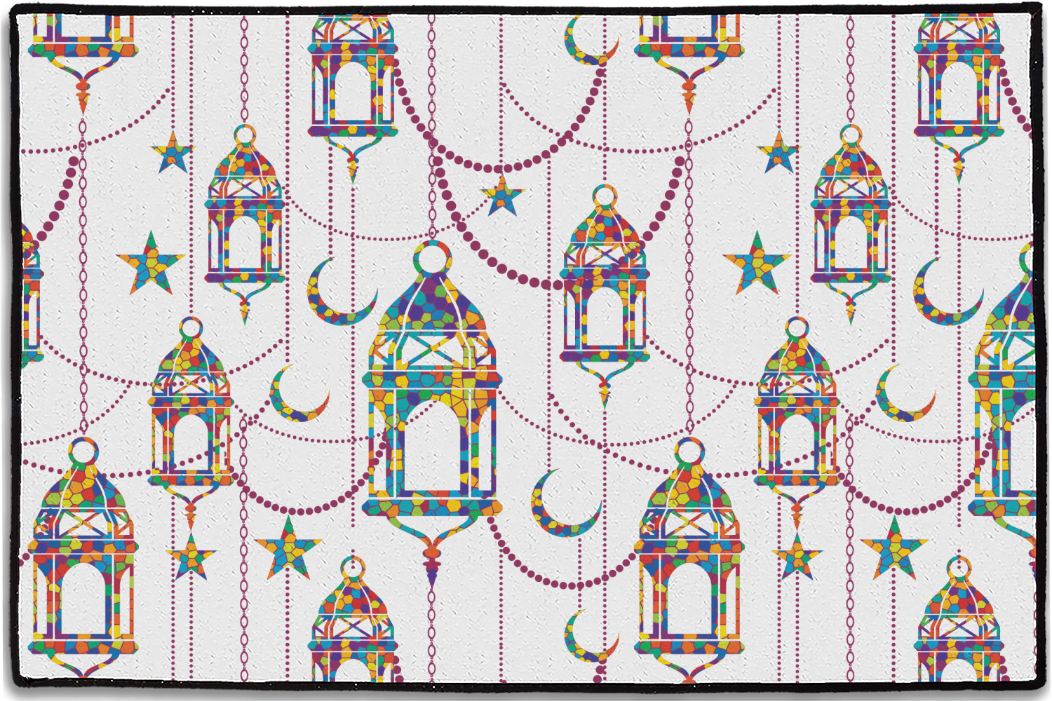 The design consists of brightly colored mosaic style lanterns with stars and moons hanging like chandeliers from chains. You'll find all sorts of colors including blue, green, yellow, and purple. We chose not to personalize the main design, however the default layout has your personalization at the bottom.