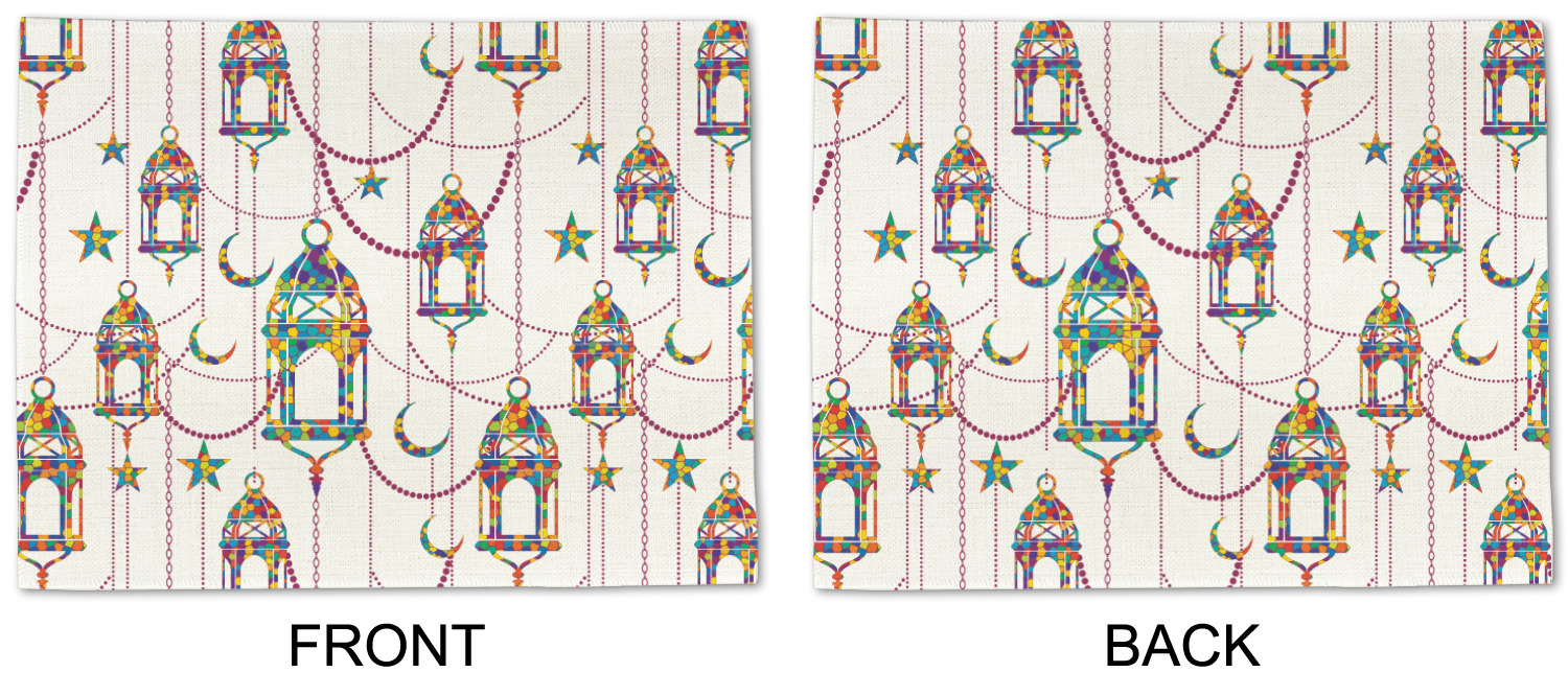 The design consists of brightly colored mosaic style lanterns with stars and moons hanging like chandeliers from chains. You'll find all sorts of colors including blue, green, yellow, and purple. We chose not to personalize the main design, however the default layout has your personalization at the bottom.
