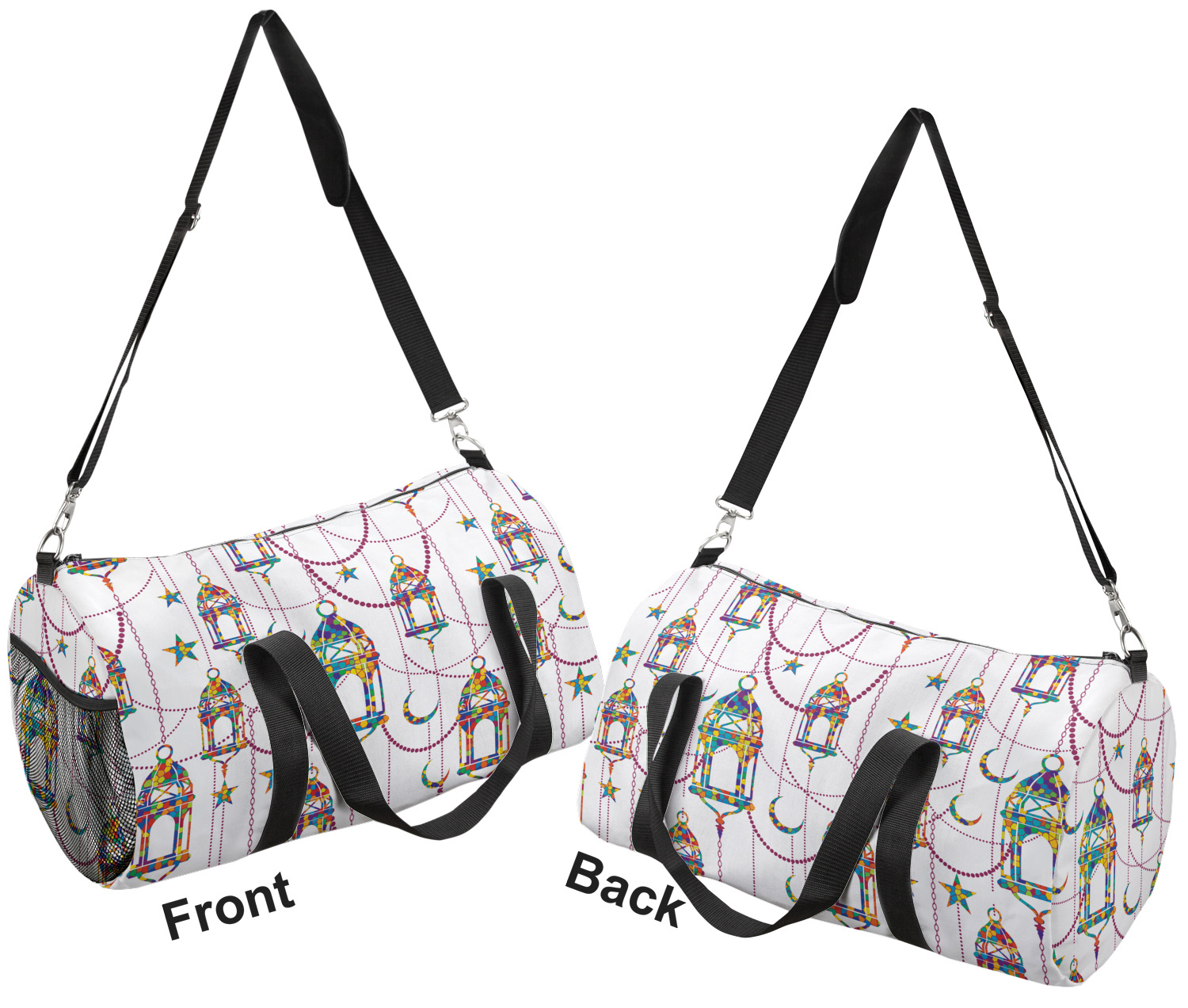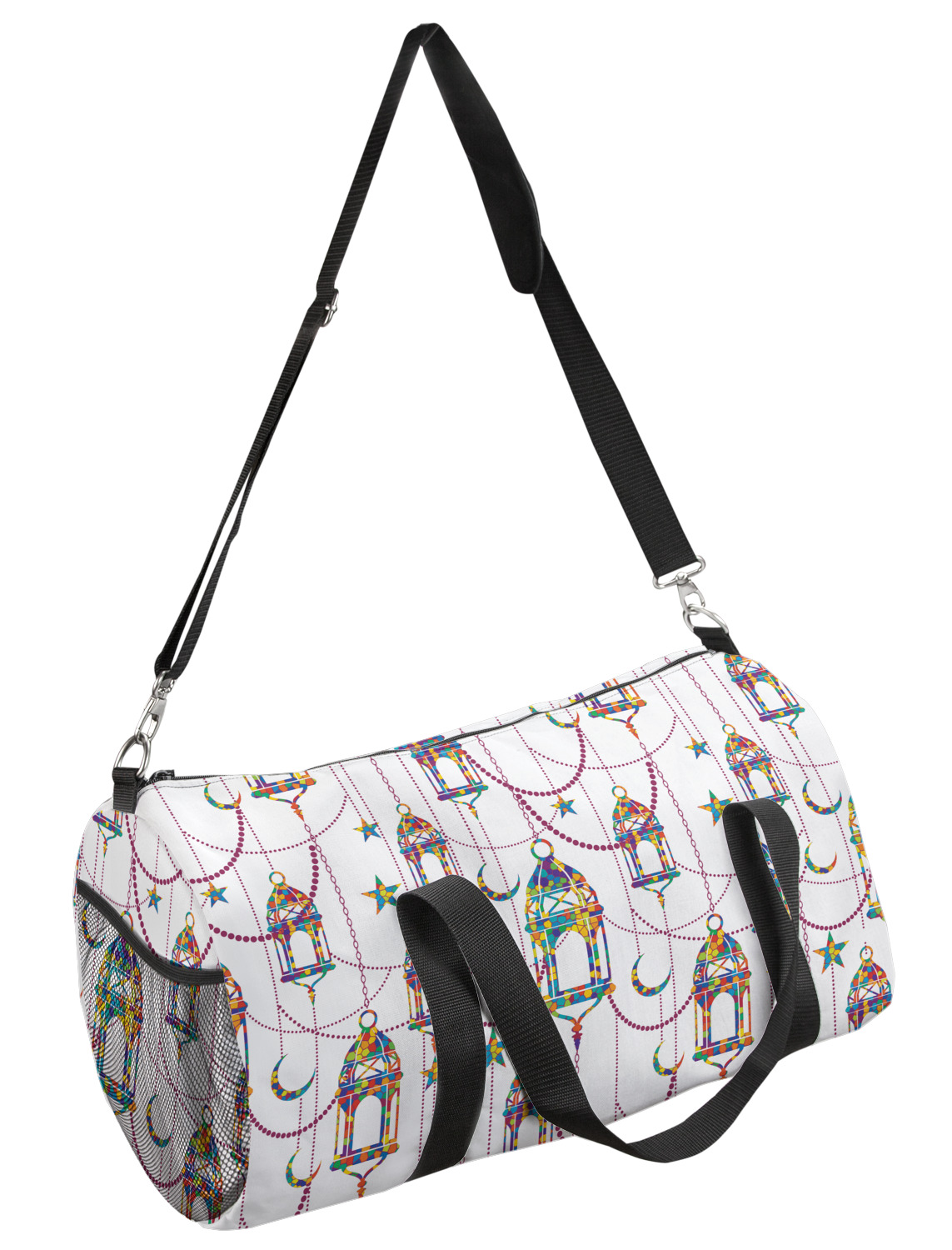 This duffle is a sturdy bag made of a canvas material. It comes in two sizes: Small (19"W x 9.5"H x 9.5"D) and Large (23"W x 12"H x 12"D). The bag is a cylindrical shape with a black adjustable strap and two handles. On one side is an elastic pouch to put a waterbottle or other small item. Your product will be sublimated with your design and is able to be designed on the front, back, and sides. Be sure to remember that the straps may cut into parts of your design if you upload your own artwork.