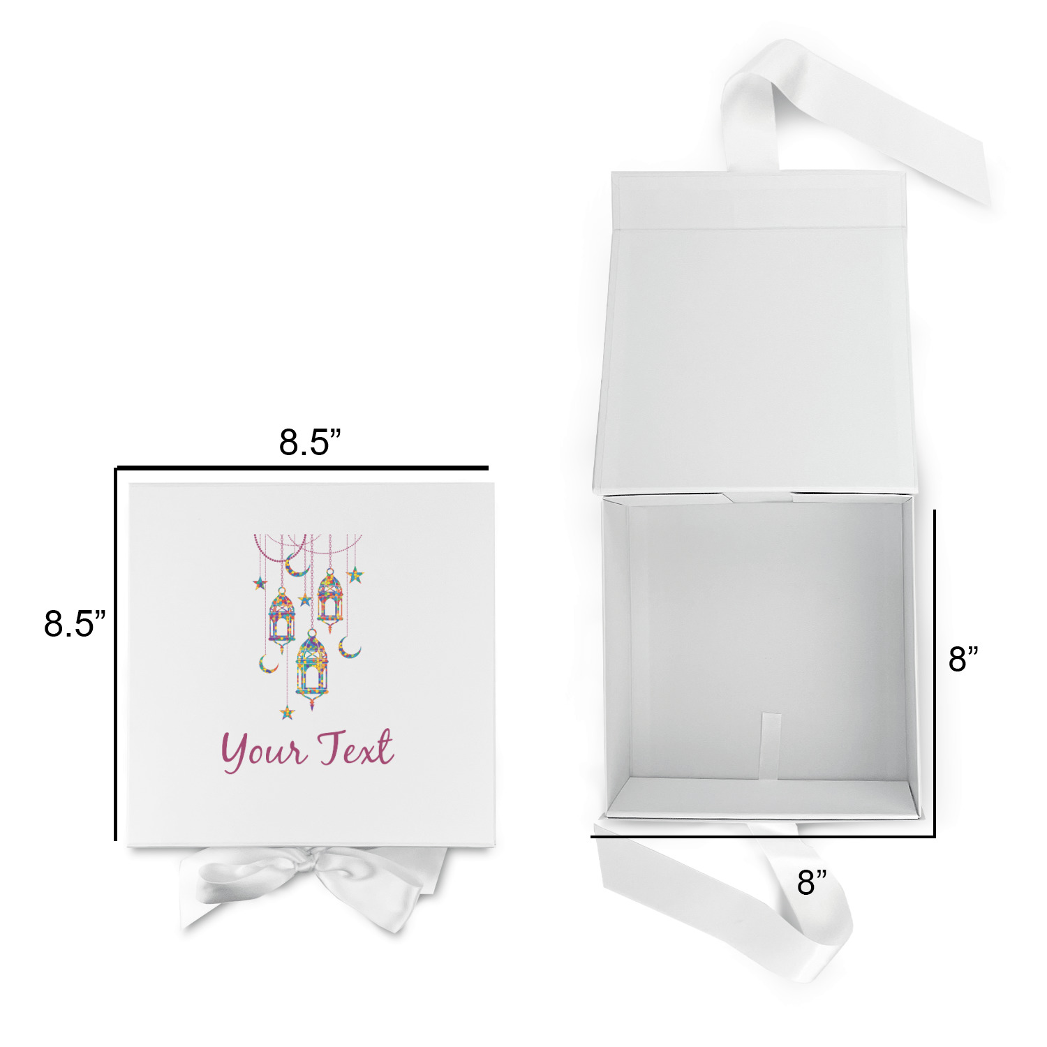 Design your own using our design library and we will print your artwork onto the lid of the gift box. When the box is closed the ribbons can be tied to secure the lid and add to the elegant look of these gift boxes.