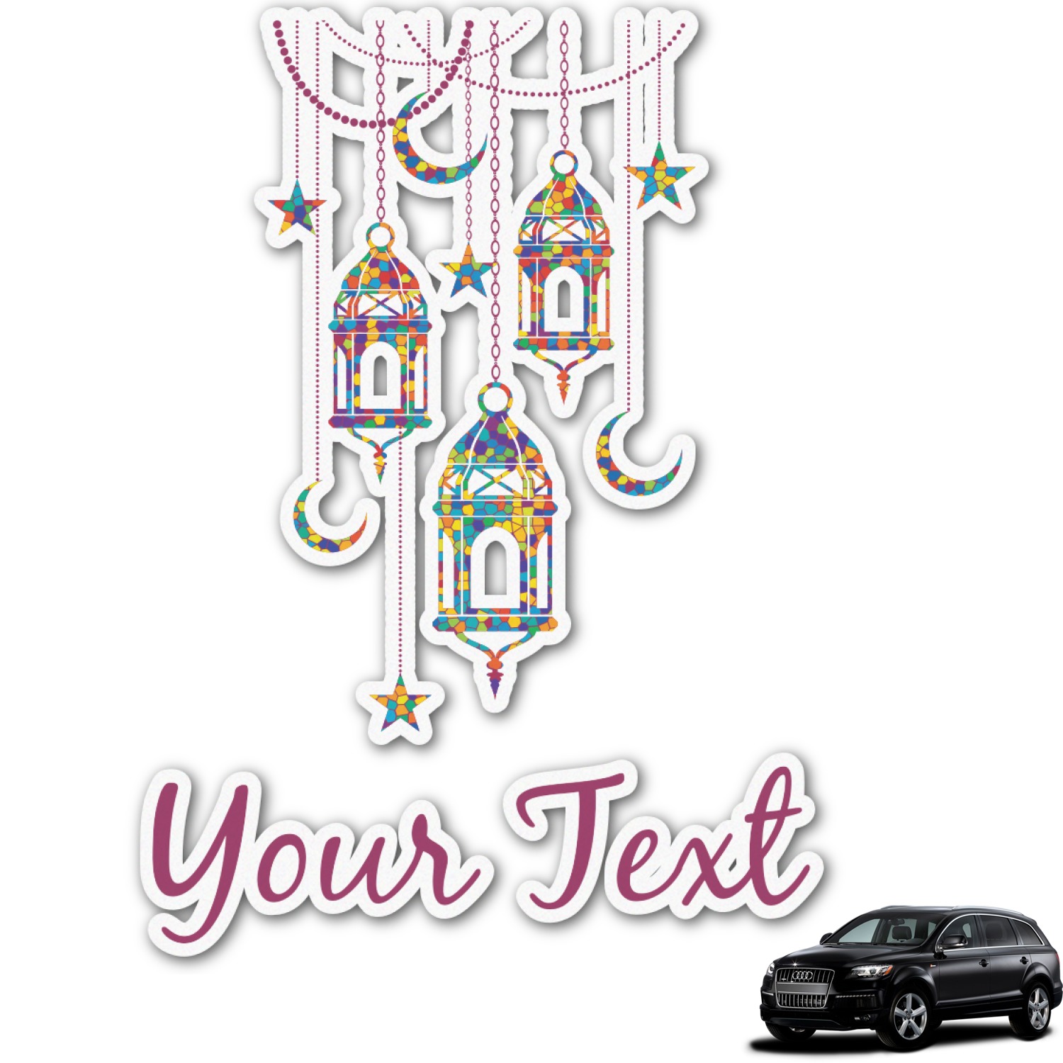 The design consists of brightly colored mosaic style lanterns with stars and moons hanging like chandeliers from chains. You'll find all sorts of colors including blue, green, yellow, and purple. We chose not to personalize the main design, however the default layout has your personalization at the bottom.
