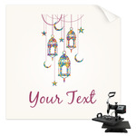 The design consists of brightly colored mosaic style lanterns with stars and moons hanging like chandeliers from chains. You'll find all sorts of colors including blue, green, yellow, and purple. We chose not to personalize the main design, however the default layout has your personalization at the bottom.