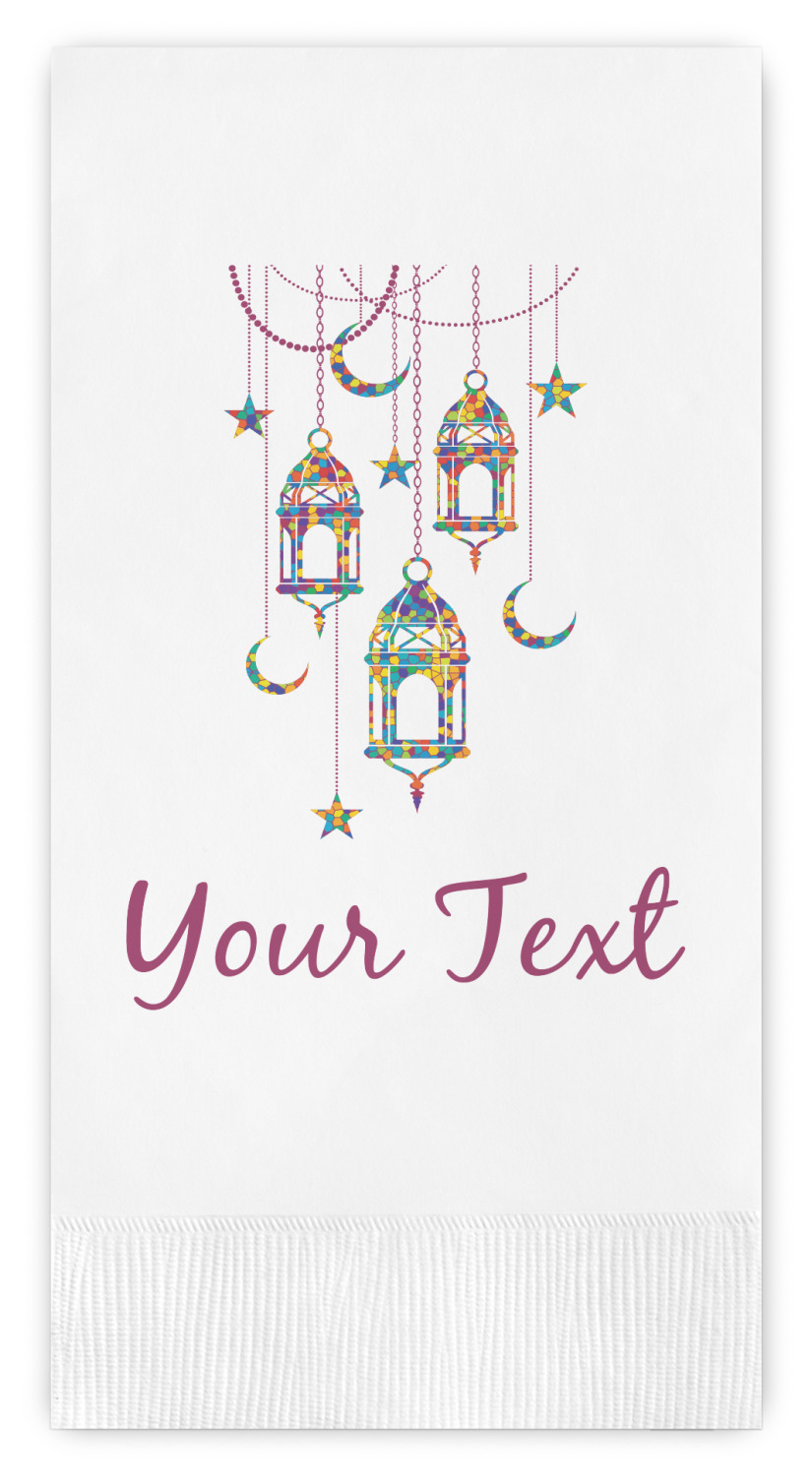 The design consists of brightly colored mosaic style lanterns with stars and moons hanging like chandeliers from chains. You'll find all sorts of colors including blue, green, yellow, and purple. We chose not to personalize the main design, however the default layout has your personalization at the bottom.