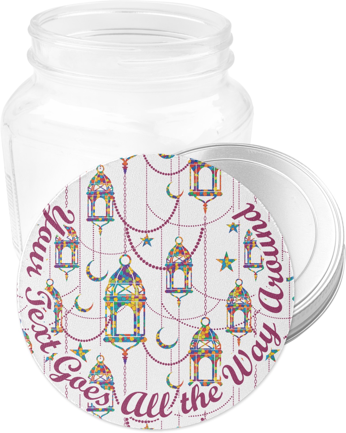 The design consists of brightly colored mosaic style lanterns with stars and moons hanging like chandeliers from chains. You'll find all sorts of colors including blue, green, yellow, and purple. We chose not to personalize the main design, however the default layout has your personalization at the bottom.