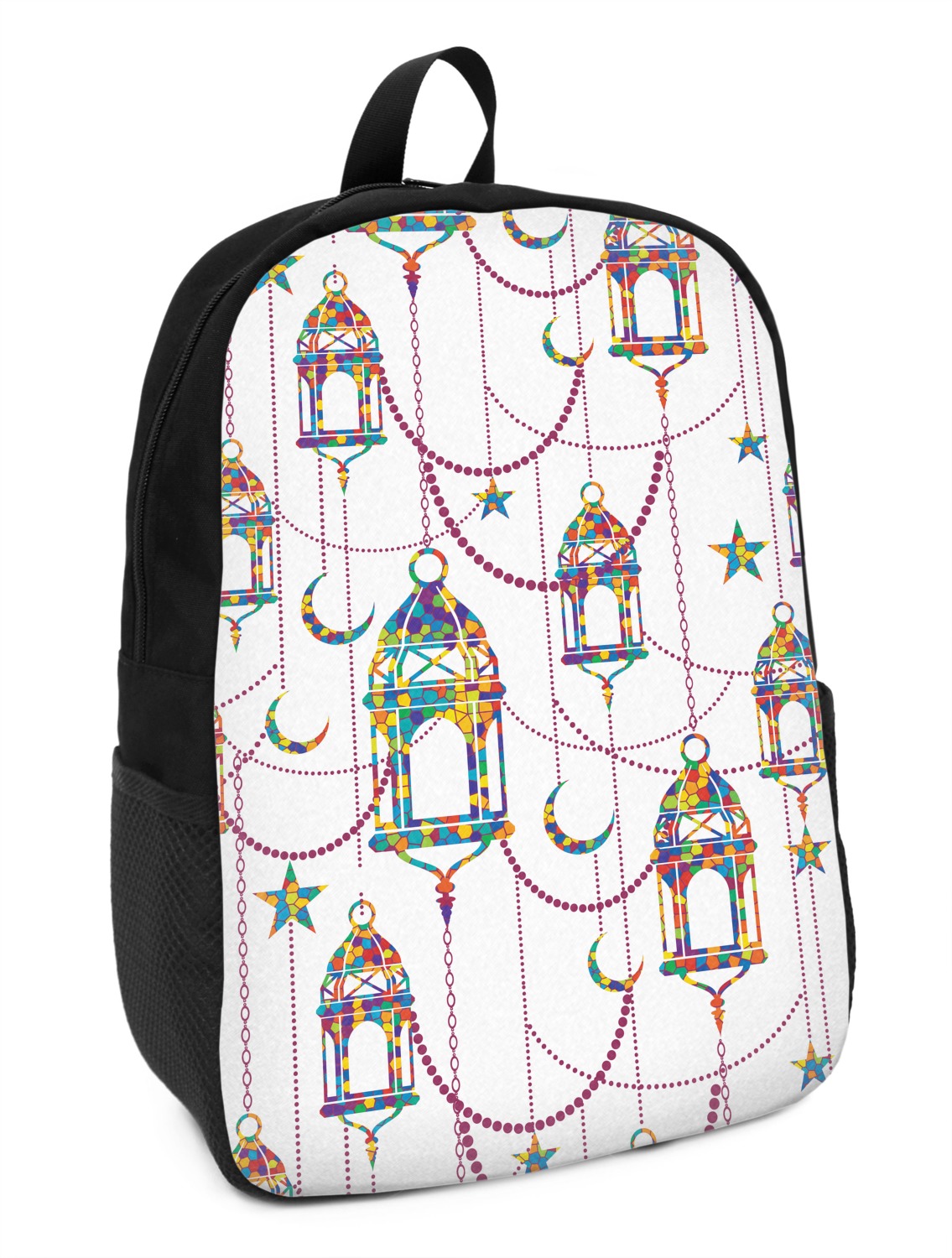 These small backpacks are made of a durable black canvas material with your personalization right on the front. The two shoulder straps are padded and easily adjustable. The bag itself measures at about 11" W x 15" H x 5" D. It's the perfect size for elementary aged kids or adults who want a smaller backpack. On the top of the bag you will find a handle to hang or carry your backpack by as well as a large zipper closure to keep all of your belongings safe inside. On each side of your backpack is a mesh pocket for a small item or water bottle. Inside your backpack you will find a spacious area with a small zipper pocket and a padded laptop slot that will fit up to a 13" laptop (13" being very snug). This is the perfect bag for any student that needs a couple books and their laptop with them at all times. It also works great as a carry on for traveling!