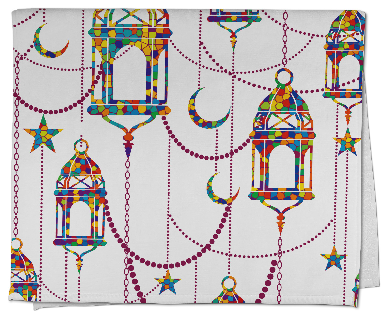 The design consists of brightly colored mosaic style lanterns with stars and moons hanging like chandeliers from chains. You'll find all sorts of colors including blue, green, yellow, and purple. We chose not to personalize the main design, however the default layout has your personalization at the bottom.