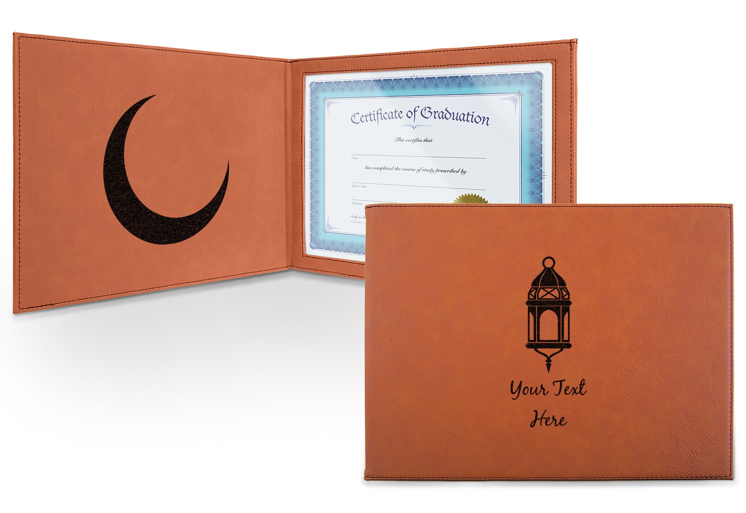 This cognac-colored, leatherette certificate jacket is the ideal way to display or store your hard-earned certificate. When closed, the custom certificate holder measures at 12 by 9 inches. The interior of the certificate cover includes a clear, vinyl window to encase your diploma. The window measures at around 10.5 by 7.5 inches and can accommodate a diploma that measures at up to 8.5 by 11 inches. You can either choose to have your customization laser engraved on the front and interior, or solely the front.