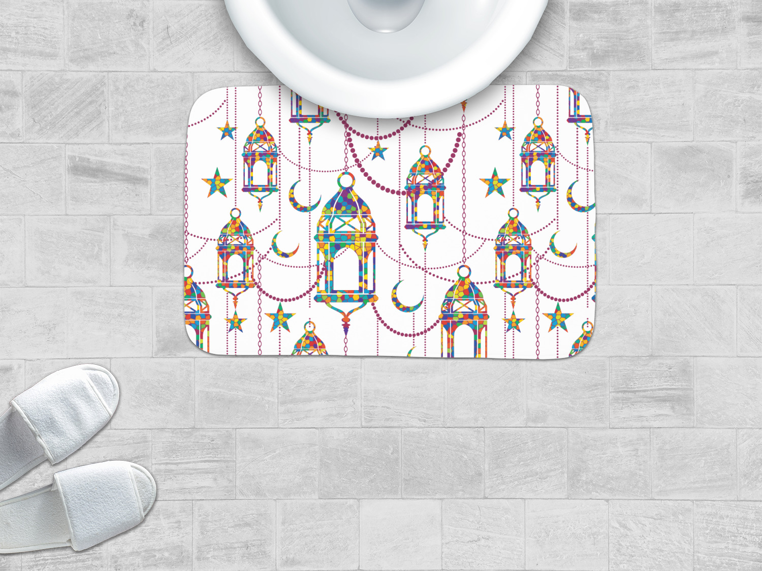The design consists of brightly colored mosaic style lanterns with stars and moons hanging like chandeliers from chains. You'll find all sorts of colors including blue, green, yellow, and purple. We chose not to personalize the main design, however the default layout has your personalization at the bottom.