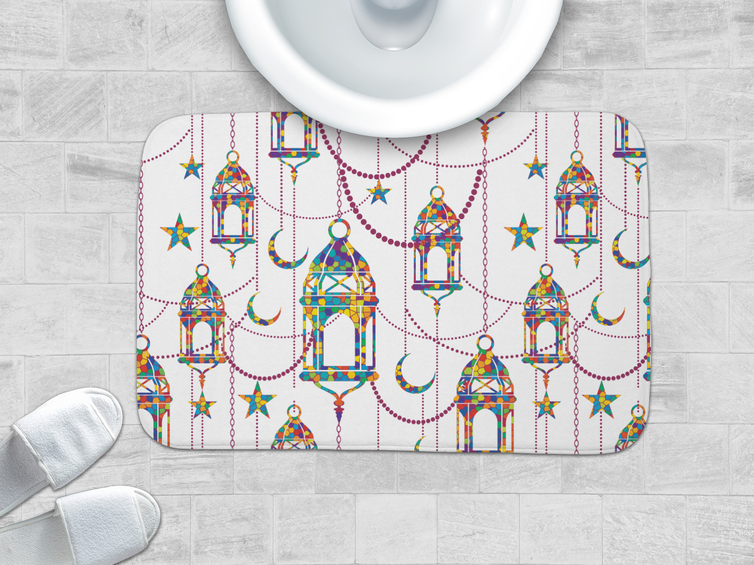 The design consists of brightly colored mosaic style lanterns with stars and moons hanging like chandeliers from chains. You'll find all sorts of colors including blue, green, yellow, and purple. We chose not to personalize the main design, however the default layout has your personalization at the bottom.