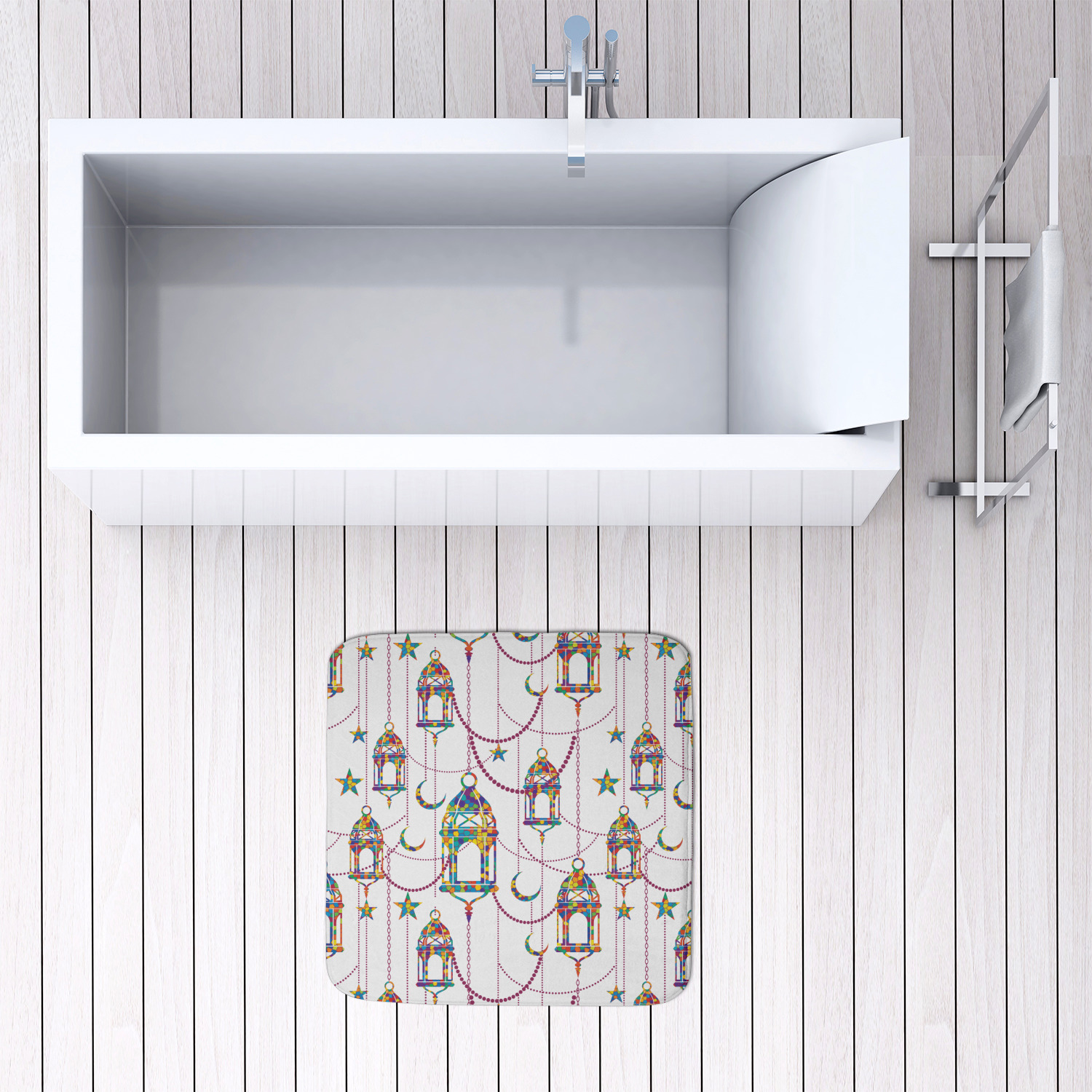 We offer this custom bath mat in four different sizes, so that you can choose the proper size for your bathroom and shower space. We suggest measuring the area before so that you can make an informed purchase. The four sizes are as follows: 24 by 17 inches, 34 by 21 inches, 48 by 36 inches, and 48 by 48 inches.