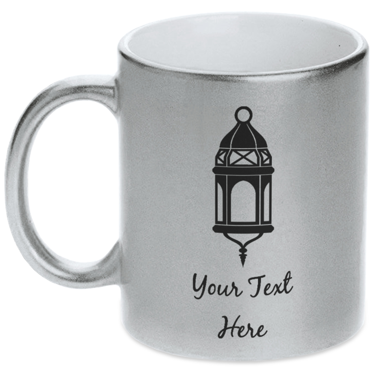 Our custom mugs are ceramic, which is great for keeping your tea or coffee warm! We offer two metallic mugs to personalize - Silver or Gold. Both styles hold around 11oz and have dimensions of approximately 3.75" x 3.5" x 4.75". Both the metallic mugs come in a matte finish and have glitter detailing to add a more pristine feel to the gold and silver base colors.