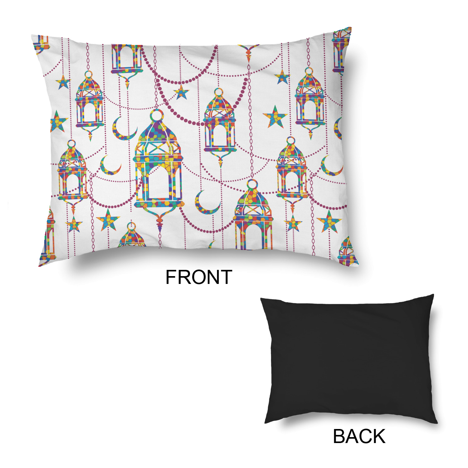 The design consists of brightly colored mosaic style lanterns with stars and moons hanging like chandeliers from chains. You'll find all sorts of colors including blue, green, yellow, and purple. We chose not to personalize the main design, however the default layout has your personalization at the bottom.