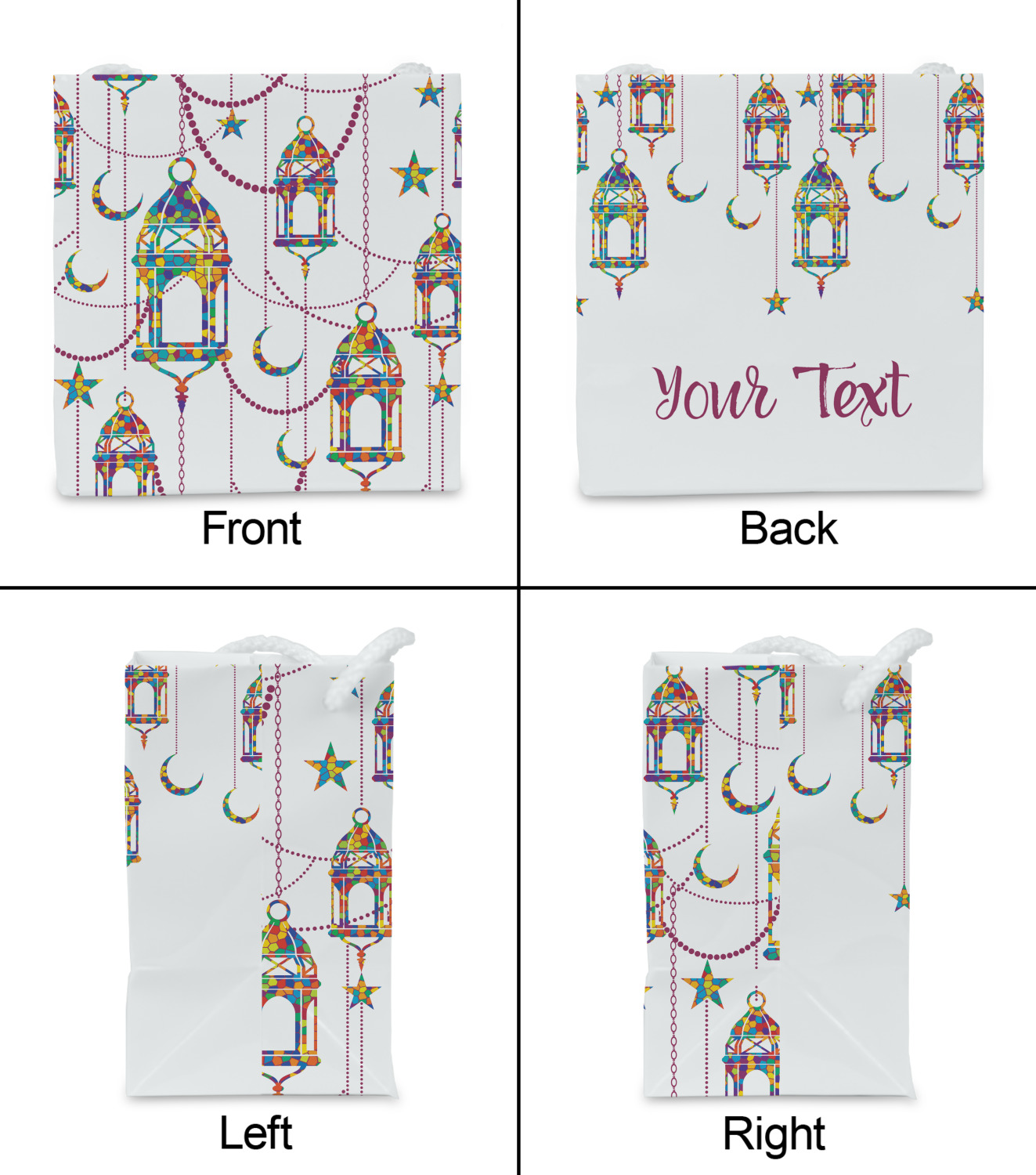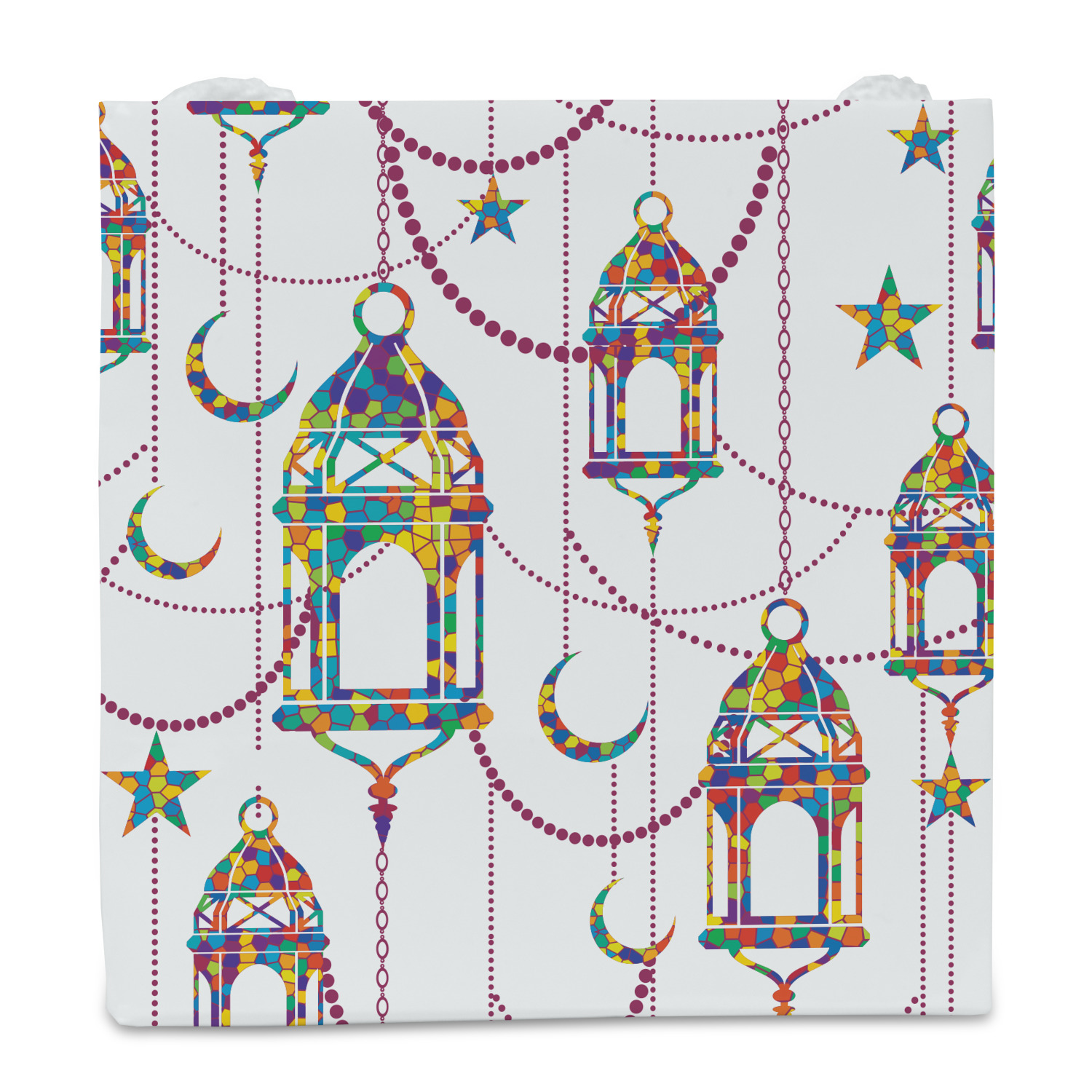 The design consists of brightly colored mosaic style lanterns with stars and moons hanging like chandeliers from chains. You'll find all sorts of colors including blue, green, yellow, and purple. We chose not to personalize the main design, however the default layout has your personalization at the bottom.