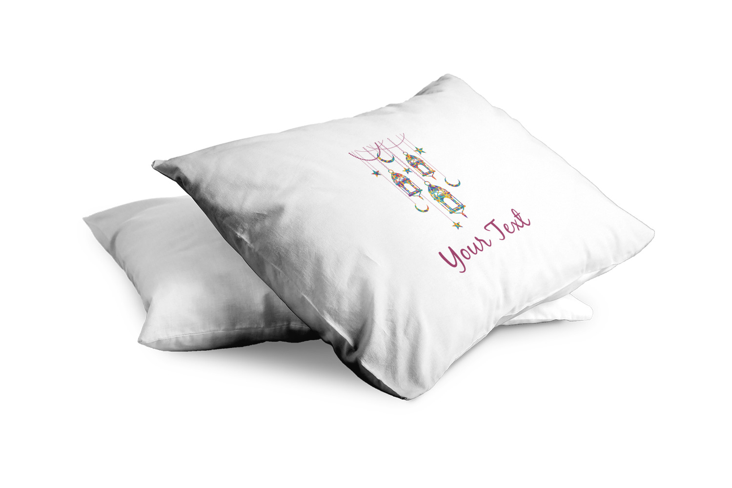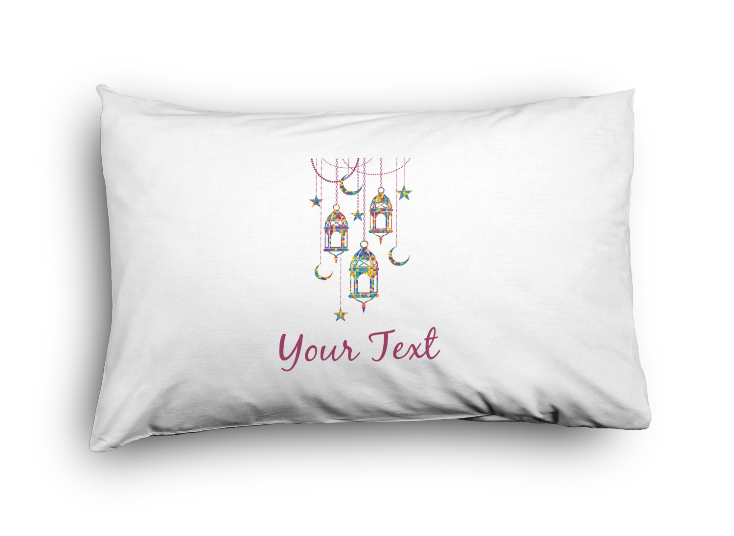The design consists of brightly colored mosaic style lanterns with stars and moons hanging like chandeliers from chains. You'll find all sorts of colors including blue, green, yellow, and purple. We chose not to personalize the main design, however the default layout has your personalization at the bottom.