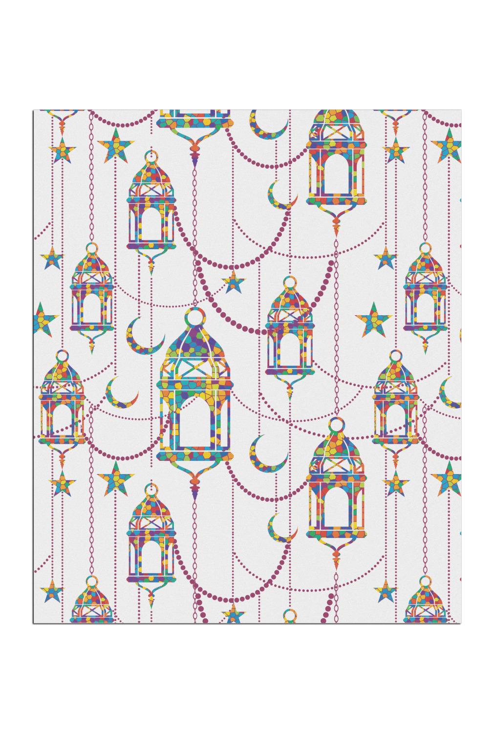 The design consists of brightly colored mosaic style lanterns with stars and moons hanging like chandeliers from chains. You'll find all sorts of colors including blue, green, yellow, and purple. We chose not to personalize the main design, however the default layout has your personalization at the bottom.