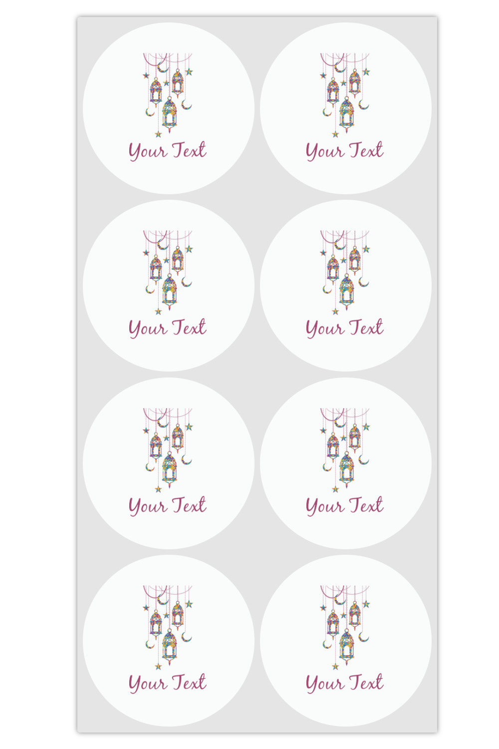 The design consists of brightly colored mosaic style lanterns with stars and moons hanging like chandeliers from chains. You'll find all sorts of colors including blue, green, yellow, and purple. We chose not to personalize the main design, however the default layout has your personalization at the bottom.