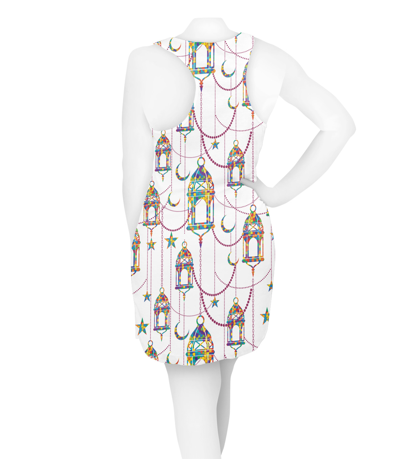 The design consists of brightly colored mosaic style lanterns with stars and moons hanging like chandeliers from chains. You'll find all sorts of colors including blue, green, yellow, and purple. We chose not to personalize the main design, however the default layout has your personalization at the bottom.