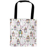The design consists of brightly colored mosaic style lanterns with stars and moons hanging like chandeliers from chains. You'll find all sorts of colors including blue, green, yellow, and purple. We chose not to personalize the main design, however the default layout has your personalization at the bottom.