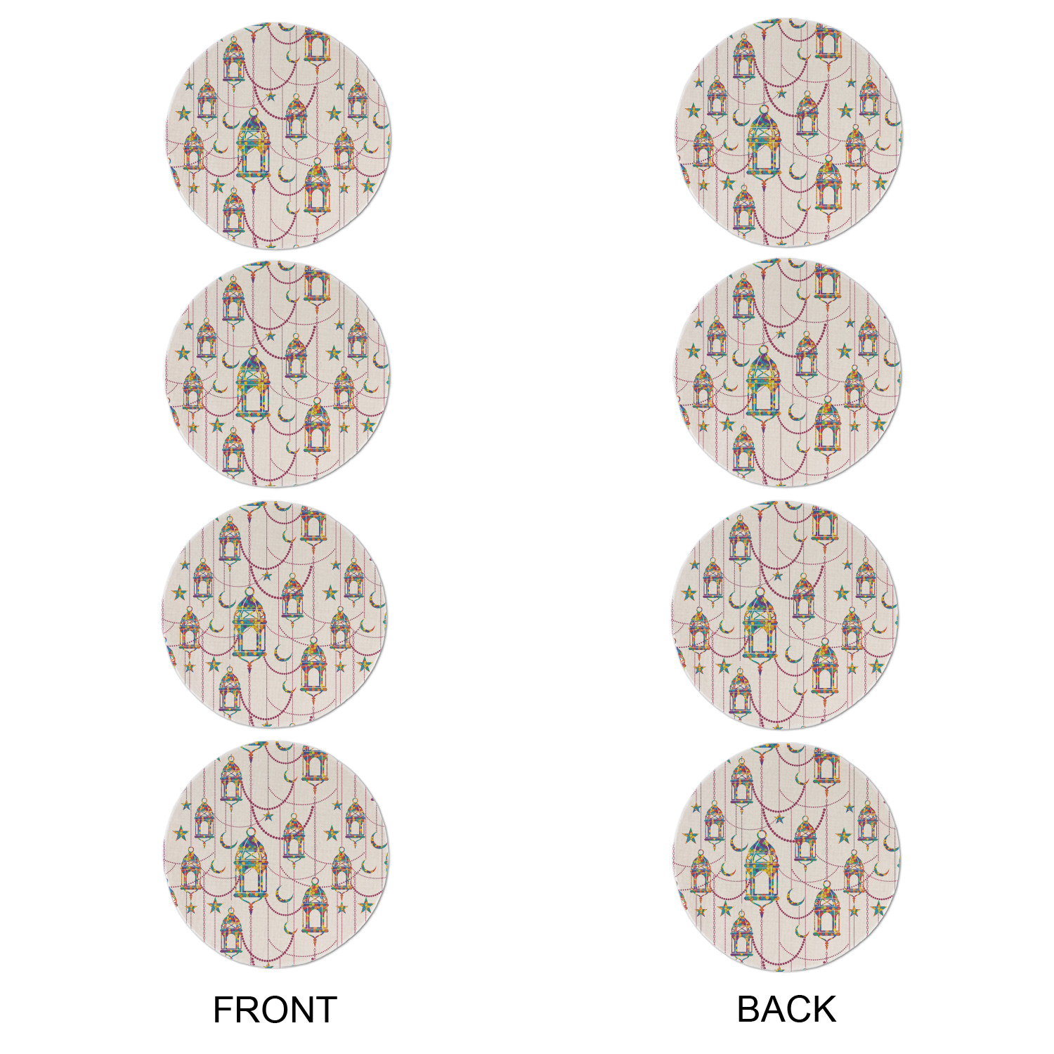 The design consists of brightly colored mosaic style lanterns with stars and moons hanging like chandeliers from chains. You'll find all sorts of colors including blue, green, yellow, and purple. We chose not to personalize the main design, however the default layout has your personalization at the bottom.