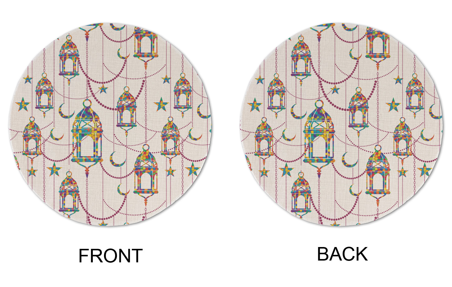 The design consists of brightly colored mosaic style lanterns with stars and moons hanging like chandeliers from chains. You'll find all sorts of colors including blue, green, yellow, and purple. We chose not to personalize the main design, however the default layout has your personalization at the bottom.