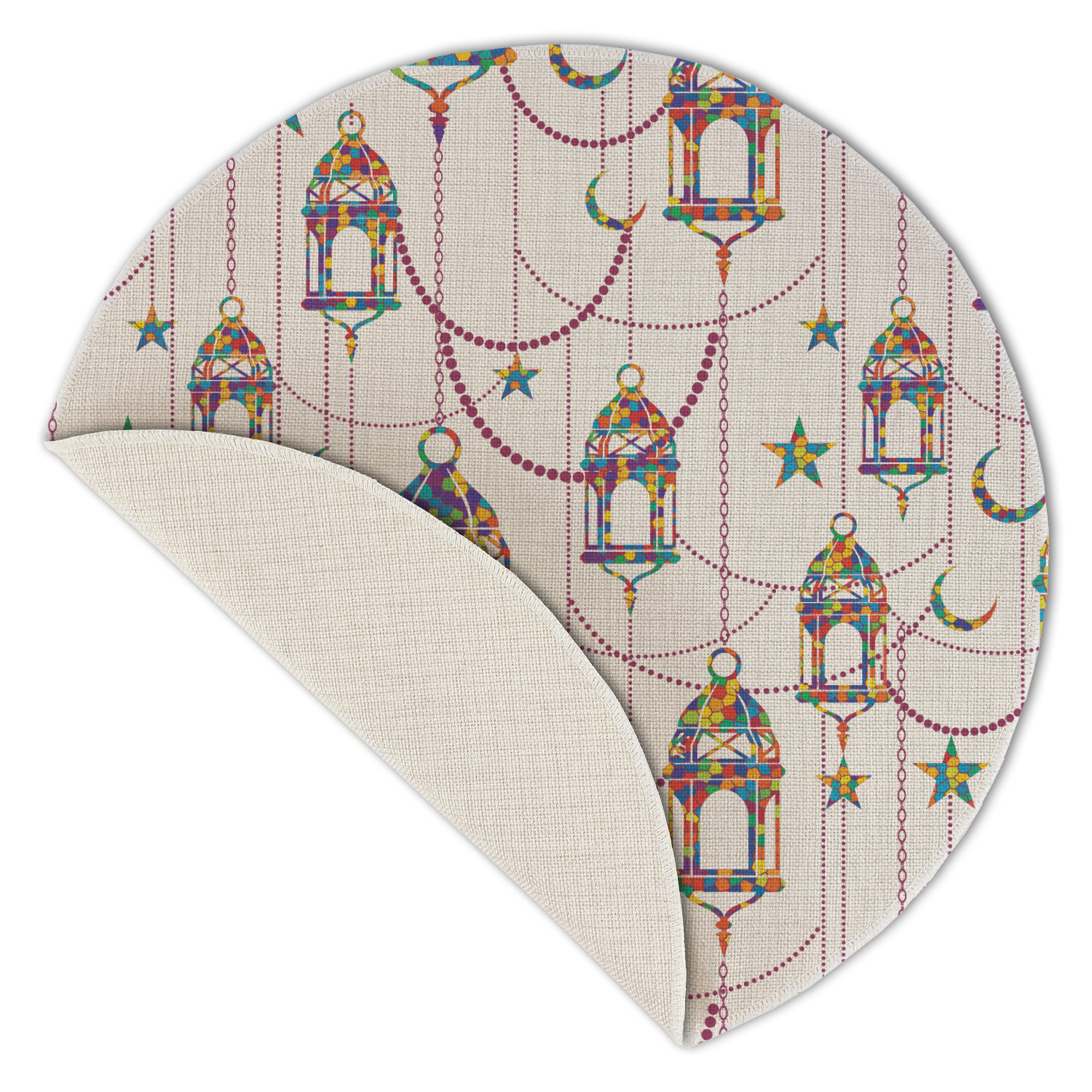 The design consists of brightly colored mosaic style lanterns with stars and moons hanging like chandeliers from chains. You'll find all sorts of colors including blue, green, yellow, and purple. We chose not to personalize the main design, however the default layout has your personalization at the bottom.