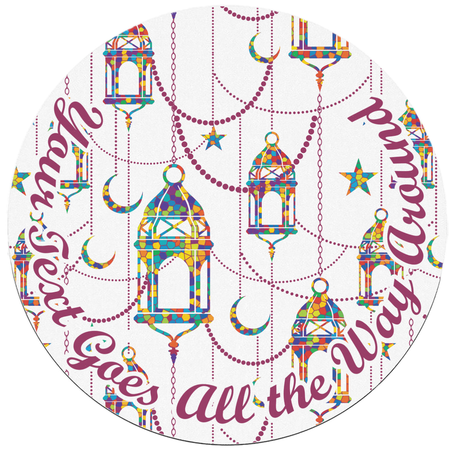The design consists of brightly colored mosaic style lanterns with stars and moons hanging like chandeliers from chains. You'll find all sorts of colors including blue, green, yellow, and purple. We chose not to personalize the main design, however the default layout has your personalization at the bottom.