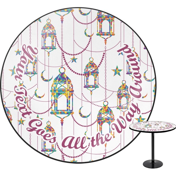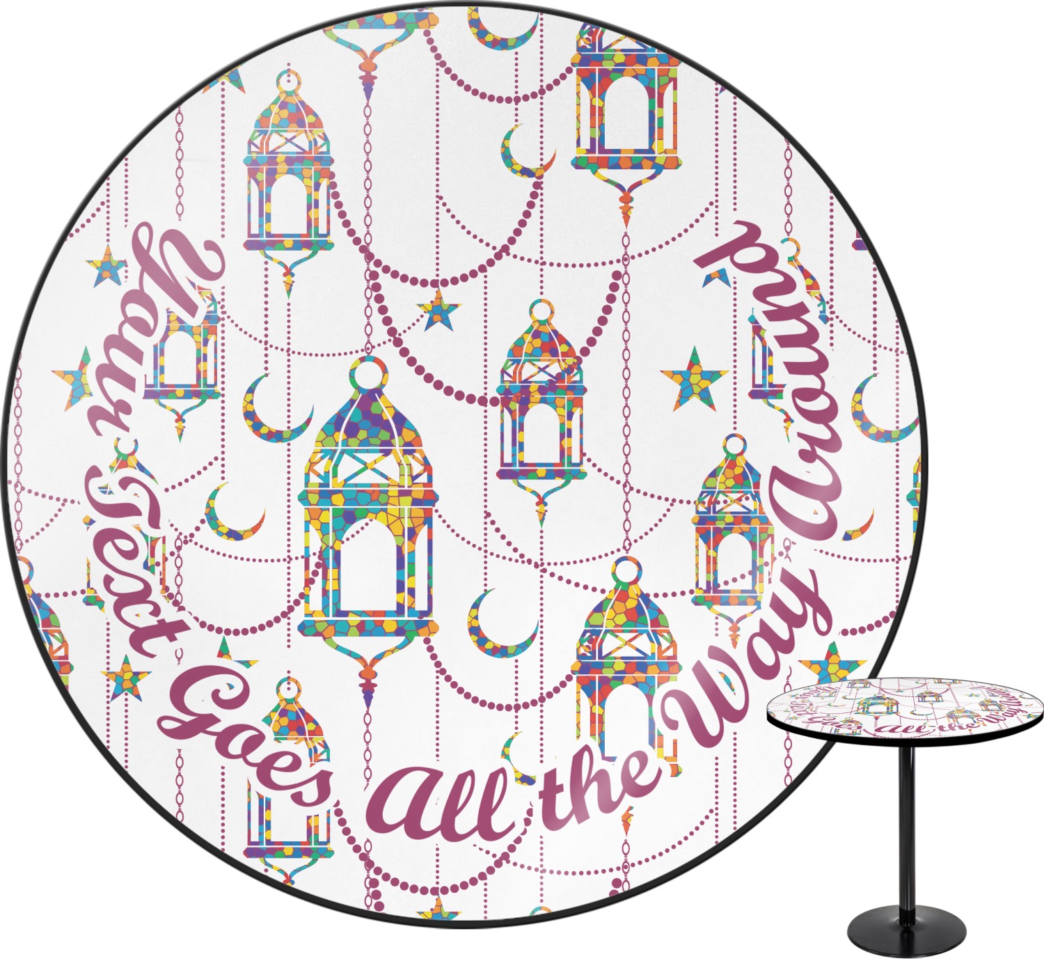 The design consists of brightly colored mosaic style lanterns with stars and moons hanging like chandeliers from chains. You'll find all sorts of colors including blue, green, yellow, and purple. We chose not to personalize the main design, however the default layout has your personalization at the bottom.