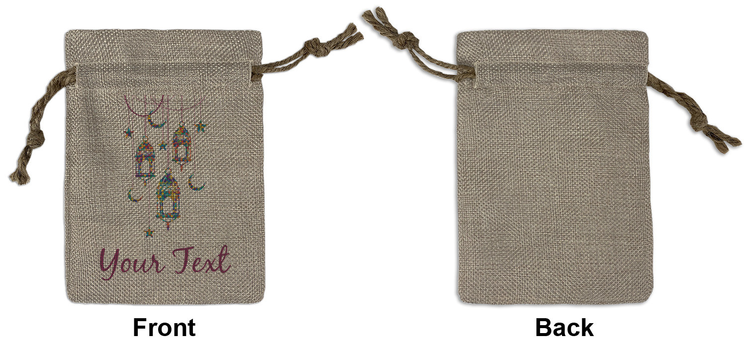 We sell our Burlap Gift Bags in 3 variant sized bags. Made with burlap polyester, each personalized bag can be secured with a twine drawstring pull. Your custom design is available to print on one side or both sides - completely up to you! The sizes of the bags measure approximately 4.5" x 6.5" for the smallest size, 6.5" x 8.0" for the medium size, and 6.5" x 13.5" for the large-sized bag.