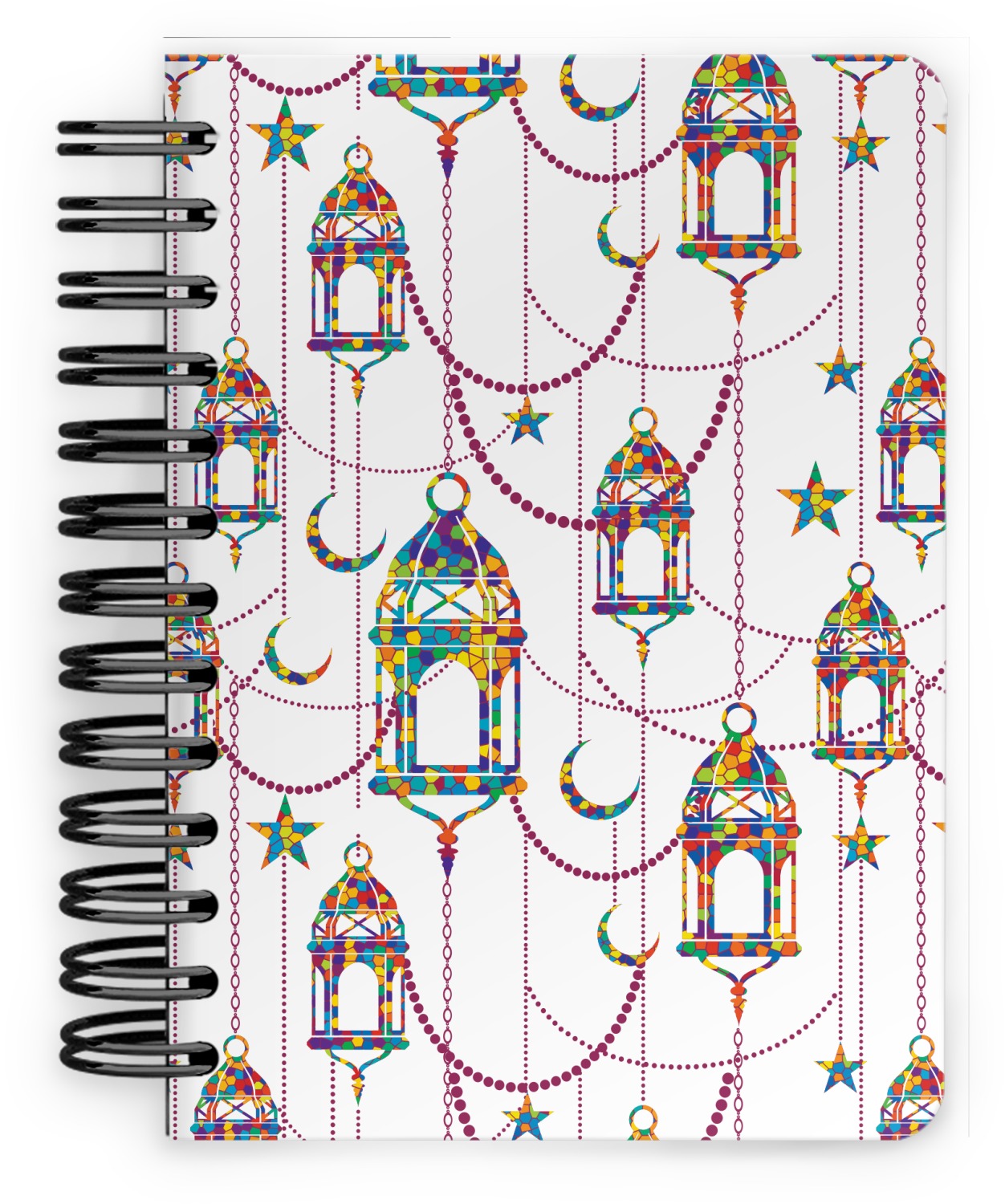 The design consists of brightly colored mosaic style lanterns with stars and moons hanging like chandeliers from chains. You'll find all sorts of colors including blue, green, yellow, and purple. We chose not to personalize the main design, however the default layout has your personalization at the bottom.