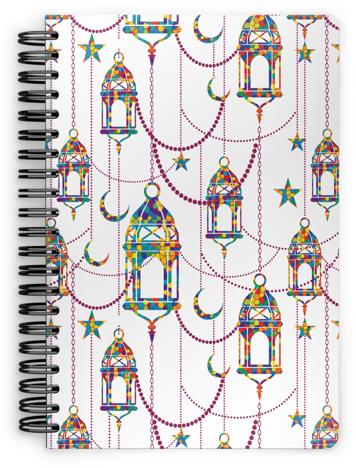 The design consists of brightly colored mosaic style lanterns with stars and moons hanging like chandeliers from chains. You'll find all sorts of colors including blue, green, yellow, and purple. We chose not to personalize the main design, however the default layout has your personalization at the bottom.