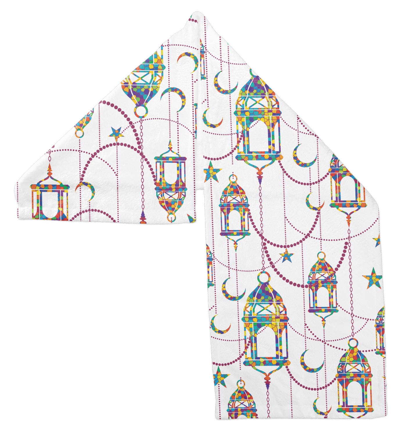 The design consists of brightly colored mosaic style lanterns with stars and moons hanging like chandeliers from chains. You'll find all sorts of colors including blue, green, yellow, and purple. We chose not to personalize the main design, however the default layout has your personalization at the bottom.