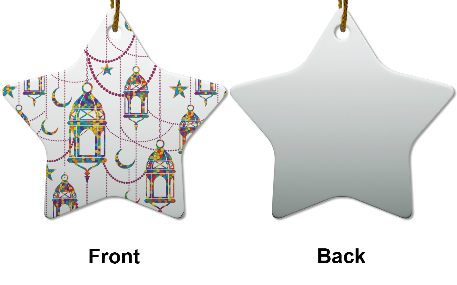 The design consists of brightly colored mosaic style lanterns with stars and moons hanging like chandeliers from chains. You'll find all sorts of colors including blue, green, yellow, and purple. We chose not to personalize the main design, however the default layout has your personalization at the bottom.