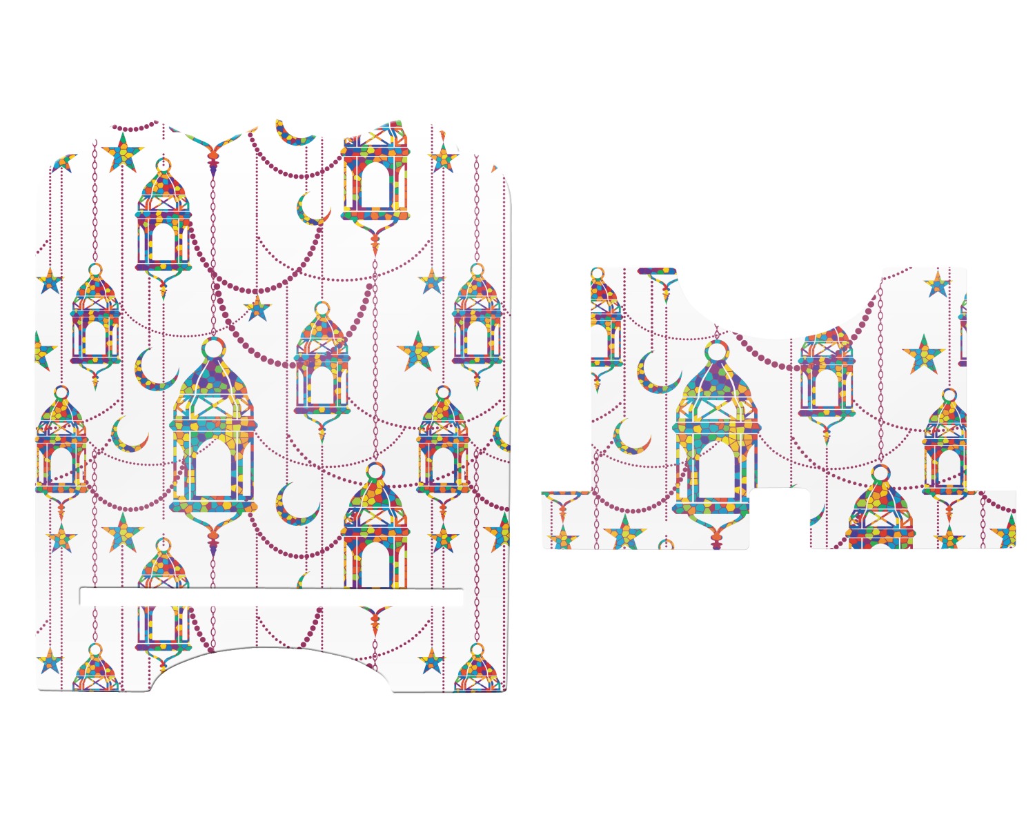 The design consists of brightly colored mosaic style lanterns with stars and moons hanging like chandeliers from chains. You'll find all sorts of colors including blue, green, yellow, and purple. We chose not to personalize the main design, however the default layout has your personalization at the bottom.