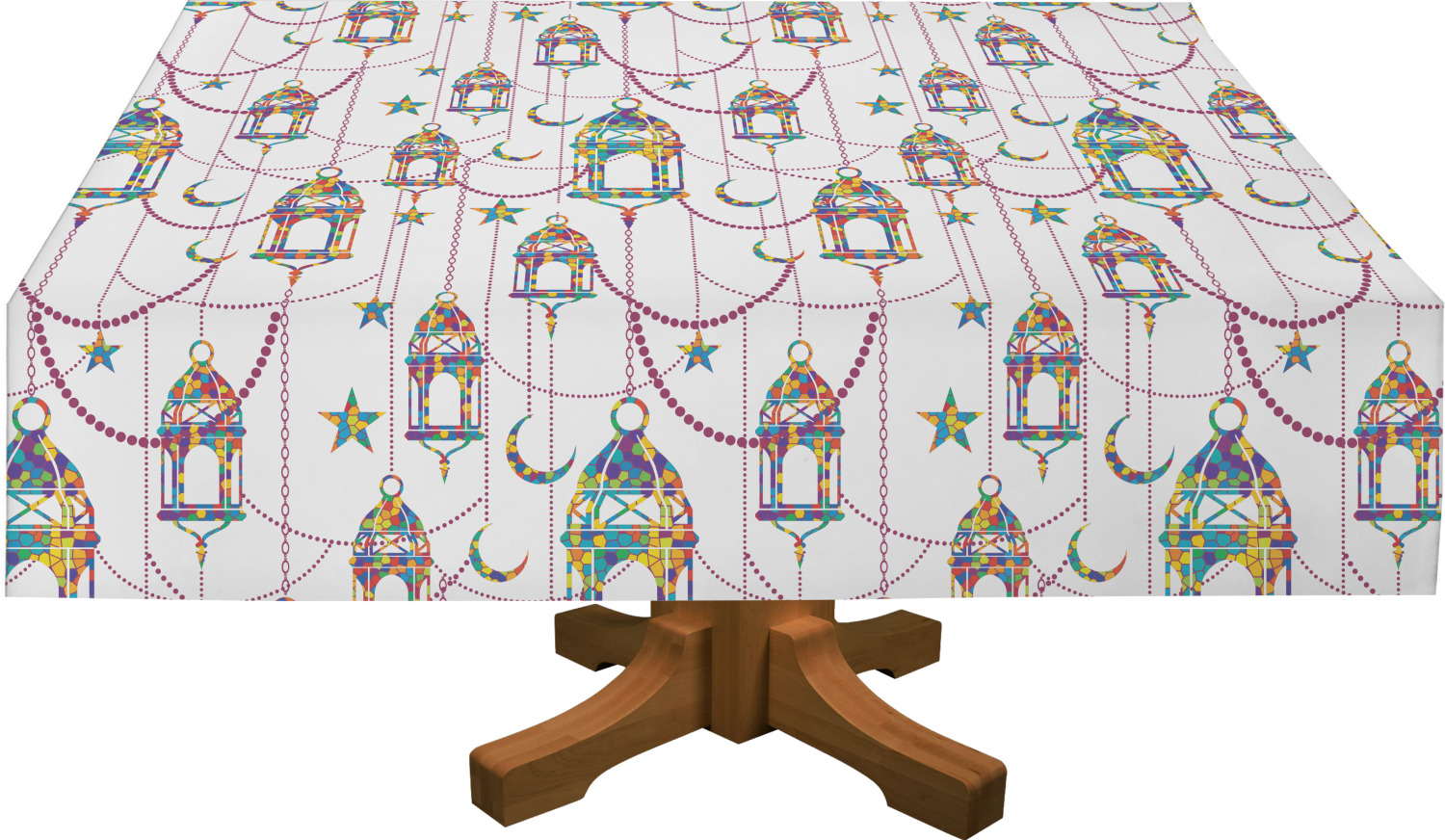 The design consists of brightly colored mosaic style lanterns with stars and moons hanging like chandeliers from chains. You'll find all sorts of colors including blue, green, yellow, and purple. We chose not to personalize the main design, however the default layout has your personalization at the bottom.