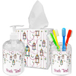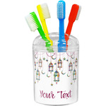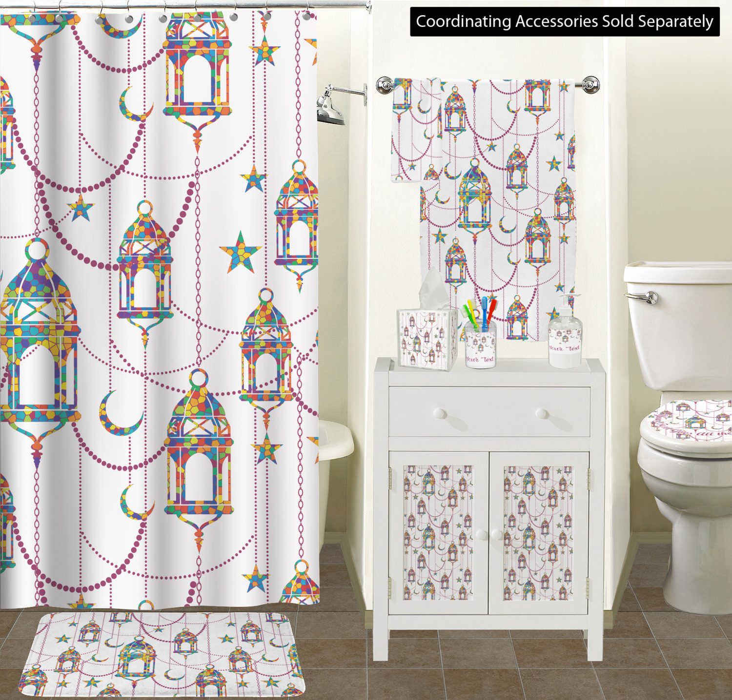 The design consists of brightly colored mosaic style lanterns with stars and moons hanging like chandeliers from chains. You'll find all sorts of colors including blue, green, yellow, and purple. We chose not to personalize the main design, however the default layout has your personalization at the bottom.