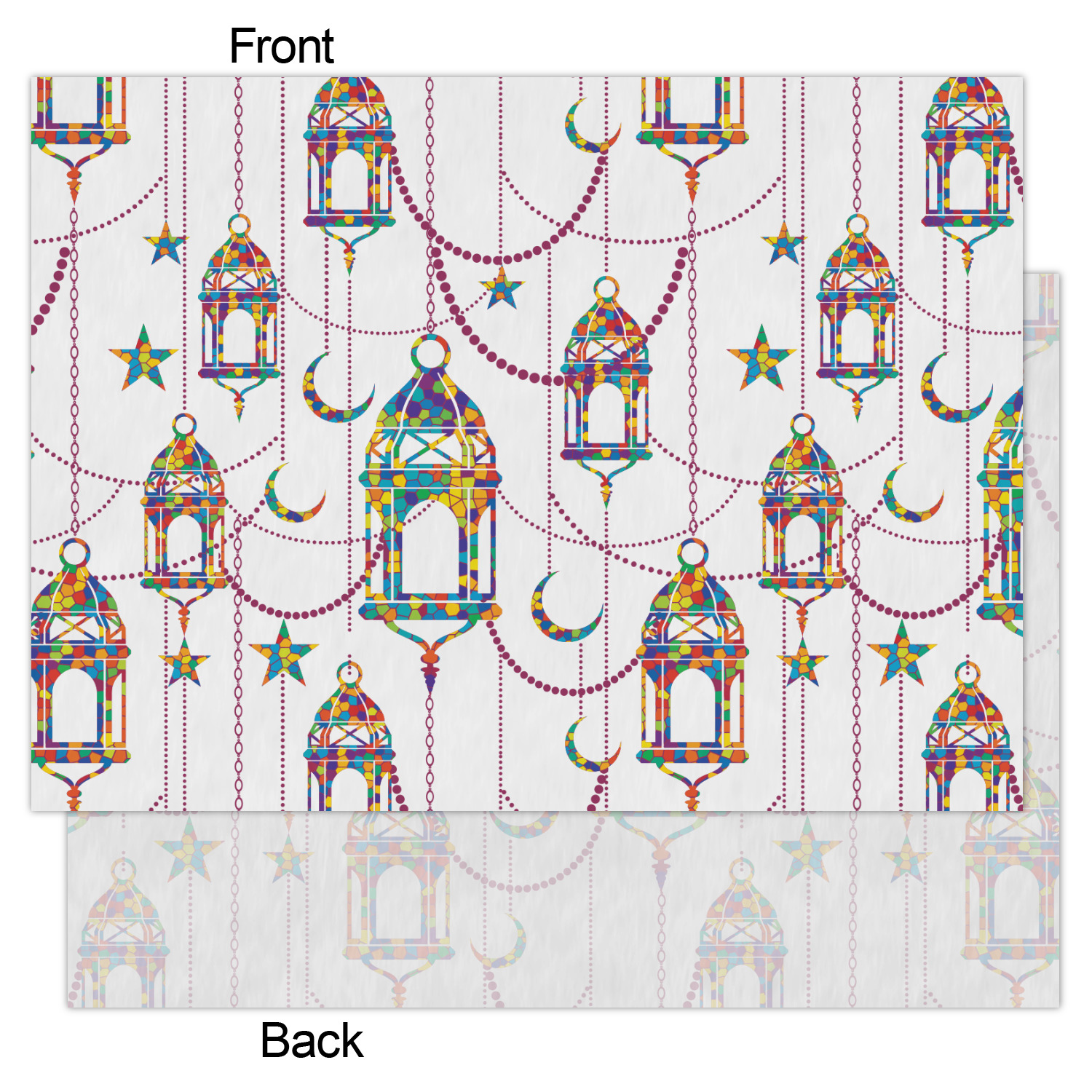 The design consists of brightly colored mosaic style lanterns with stars and moons hanging like chandeliers from chains. You'll find all sorts of colors including blue, green, yellow, and purple. We chose not to personalize the main design, however the default layout has your personalization at the bottom.