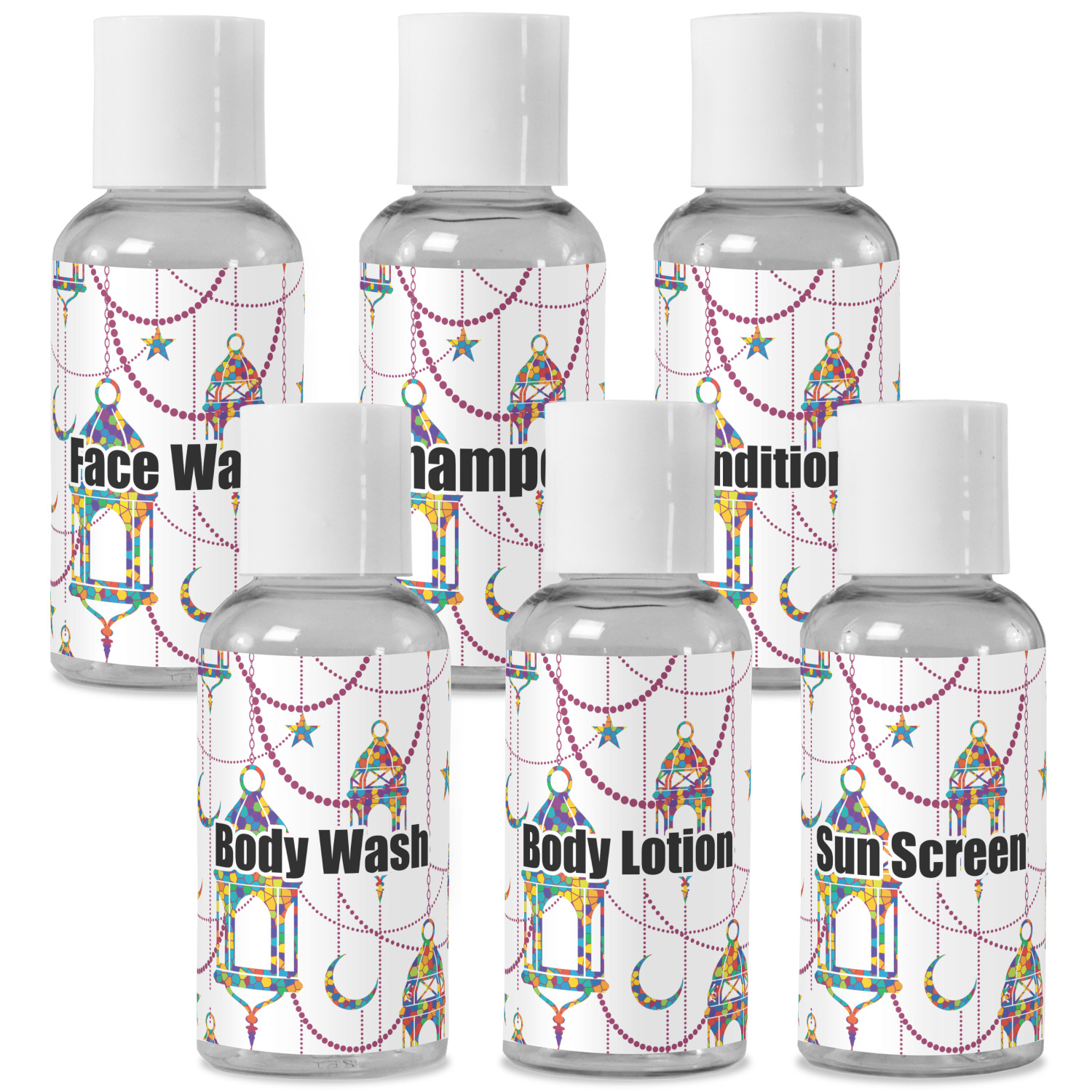 These soap and lotion travel bottles are the perfect place to start. Each set comes with 6 clear plastic bottles with white pop top lids. The bottles are cylindrical and can hold approximately 2.7oz. Perfect for plane travel!