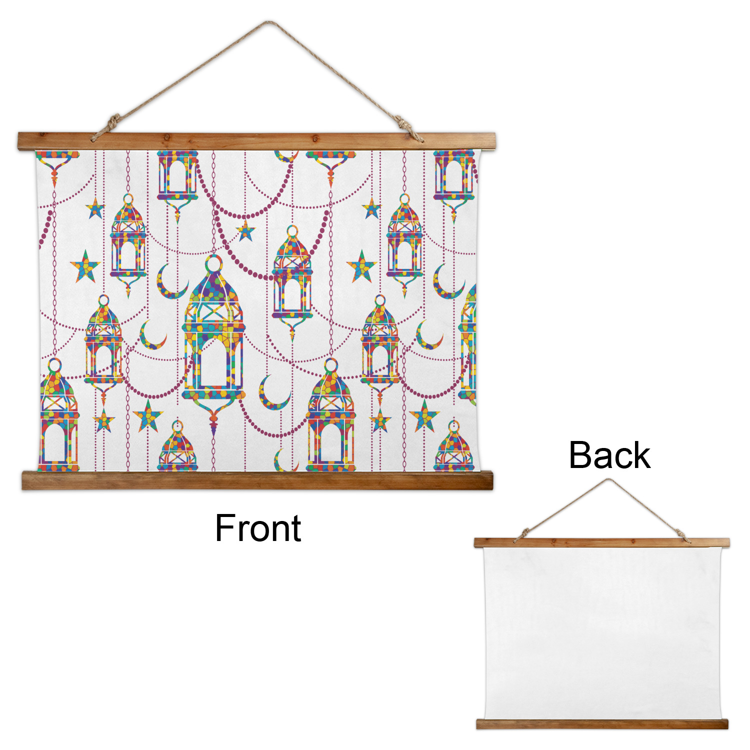 Made in two different orientations - portrait or landscape - both are 26" x 36". Your design is printed on a high quality polyester fabric with hemmed edges. The wood on the top and bottom of the tapestry is 1.25" tall and 0.25" thick and there are two pieces on top and bottom which sandwich the fabric.