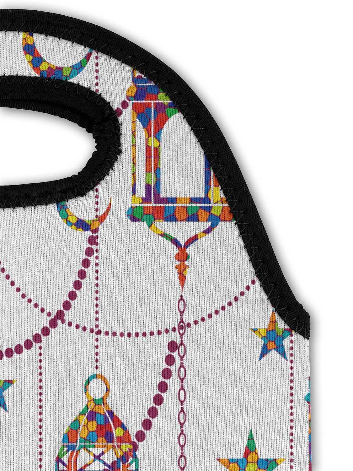 The design consists of brightly colored mosaic style lanterns with stars and moons hanging like chandeliers from chains. You'll find all sorts of colors including blue, green, yellow, and purple. We chose not to personalize the main design, however the default layout has your personalization at the bottom.