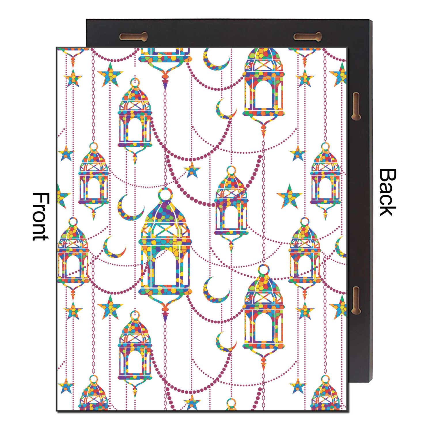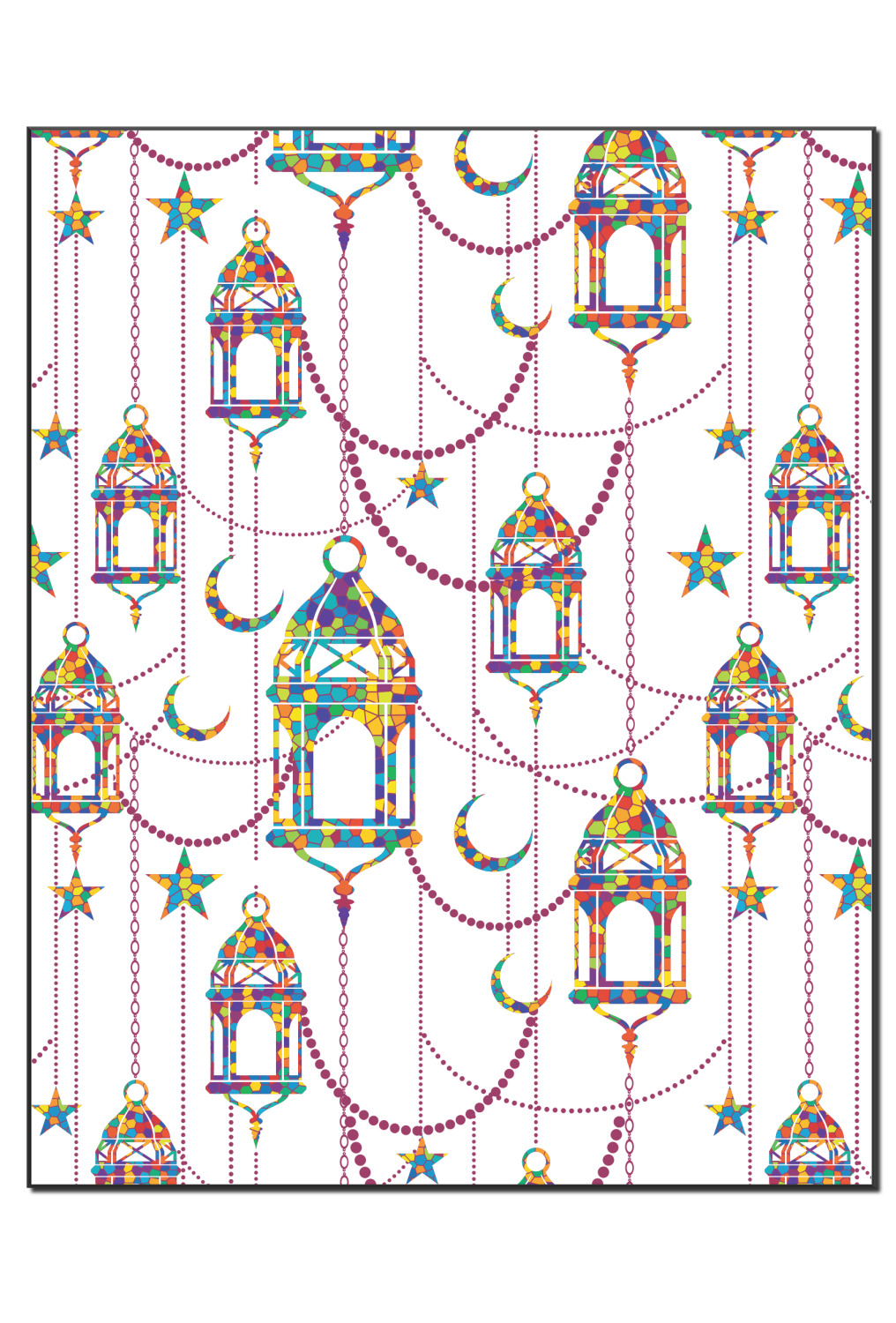 The design consists of brightly colored mosaic style lanterns with stars and moons hanging like chandeliers from chains. You'll find all sorts of colors including blue, green, yellow, and purple. We chose not to personalize the main design, however the default layout has your personalization at the bottom.