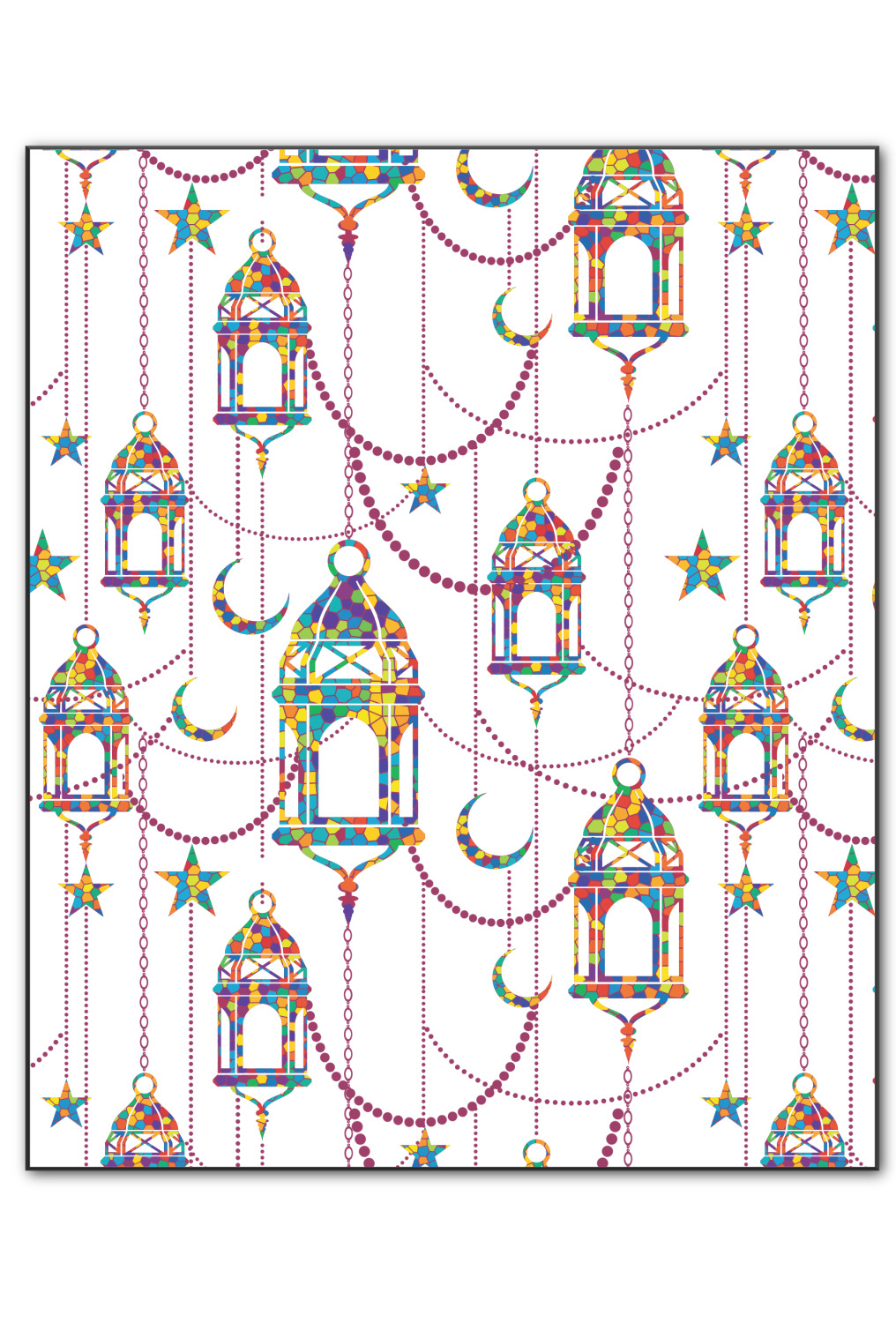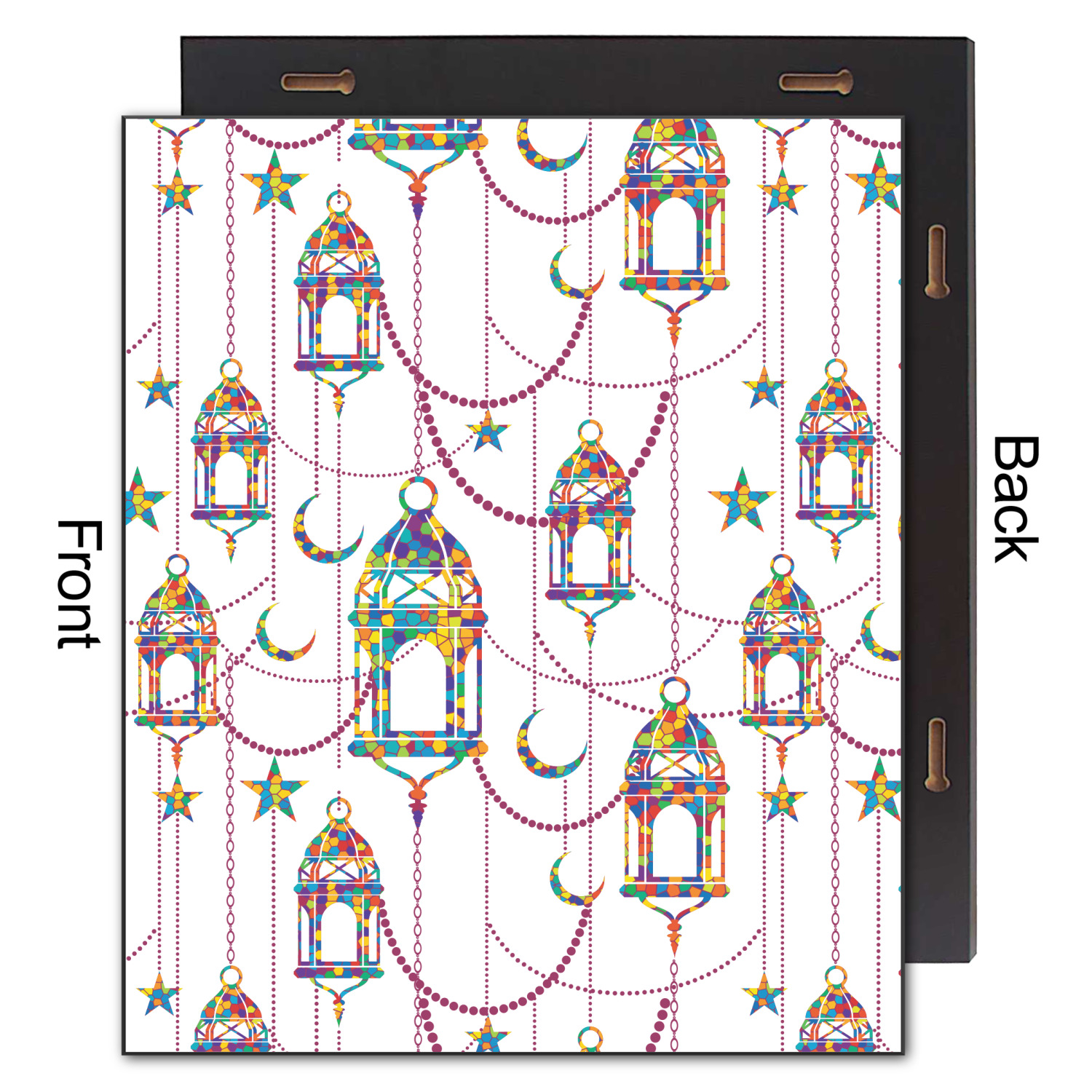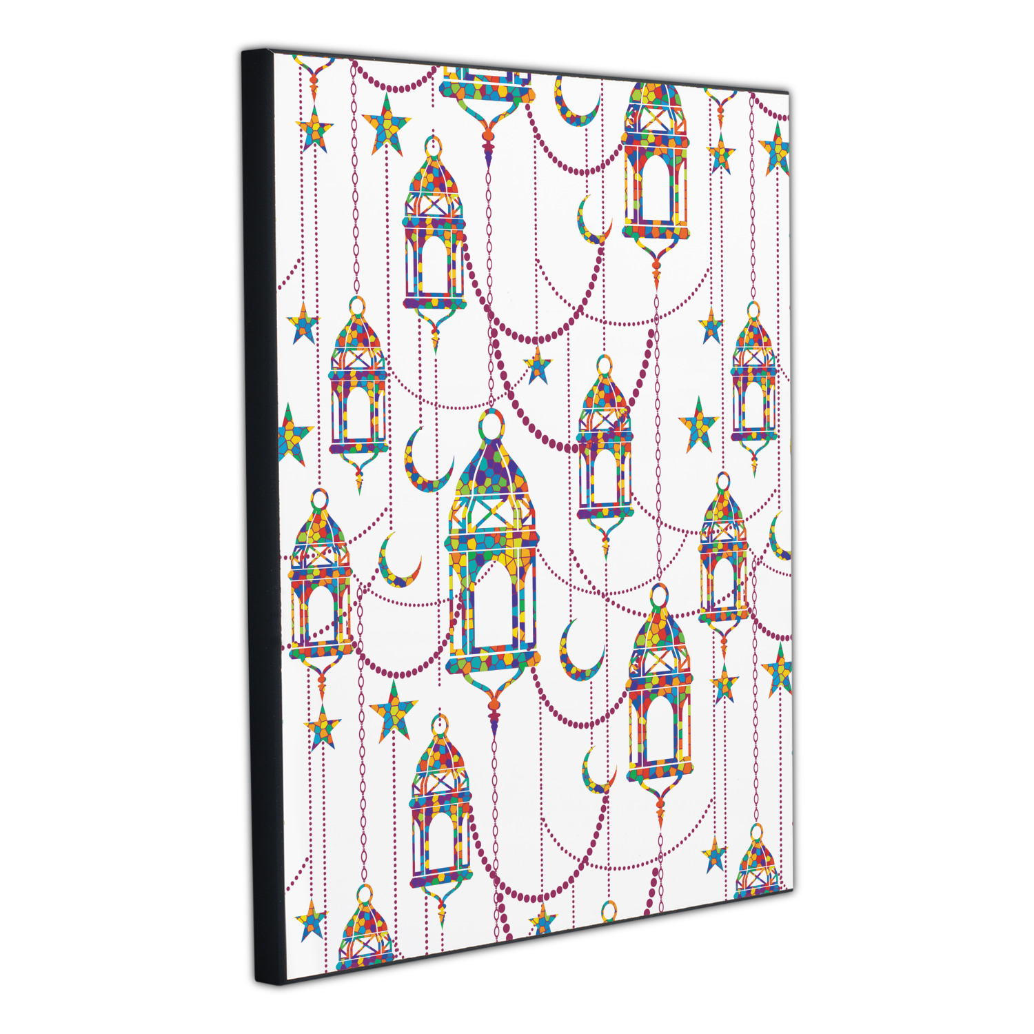 The design consists of brightly colored mosaic style lanterns with stars and moons hanging like chandeliers from chains. You'll find all sorts of colors including blue, green, yellow, and purple. We chose not to personalize the main design, however the default layout has your personalization at the bottom.
