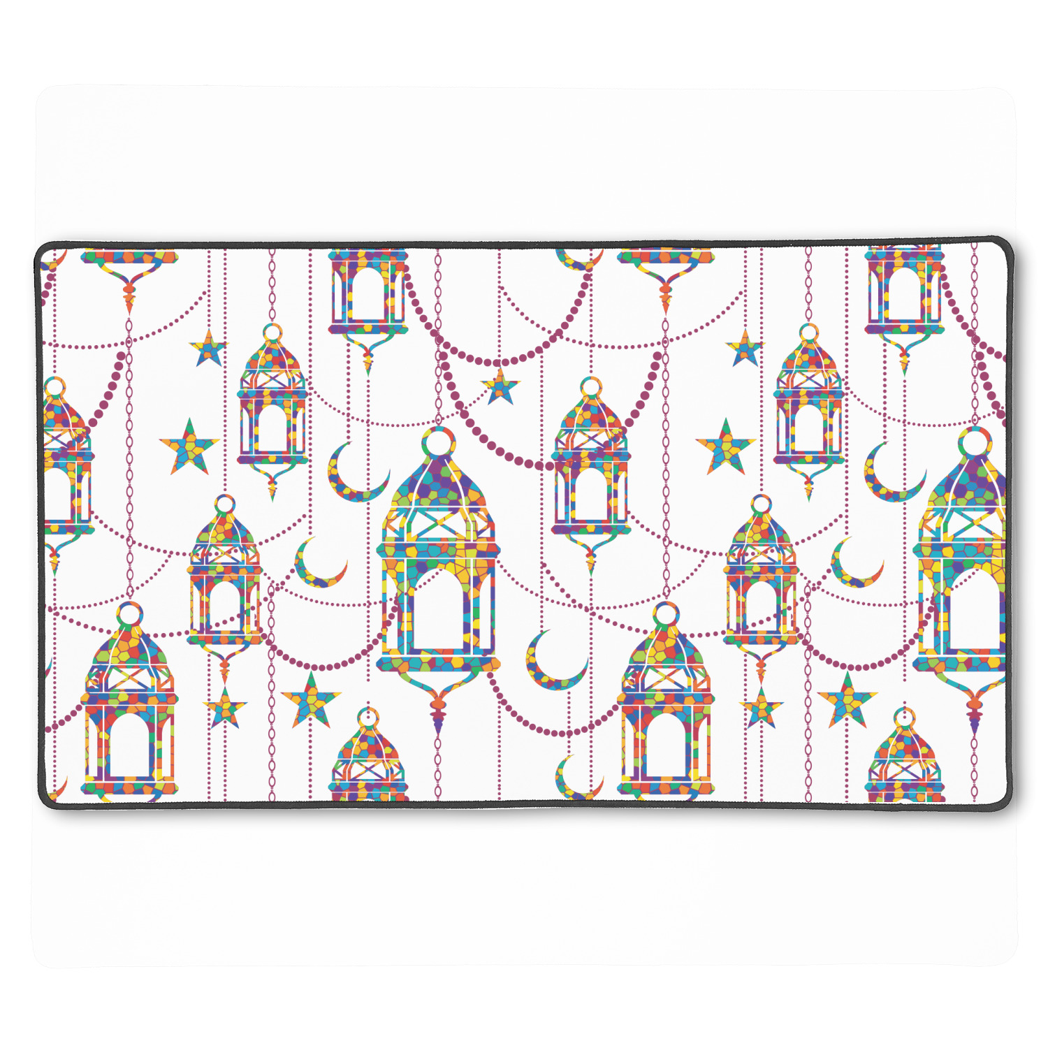 The design consists of brightly colored mosaic style lanterns with stars and moons hanging like chandeliers from chains. You'll find all sorts of colors including blue, green, yellow, and purple. We chose not to personalize the main design, however the default layout has your personalization at the bottom.