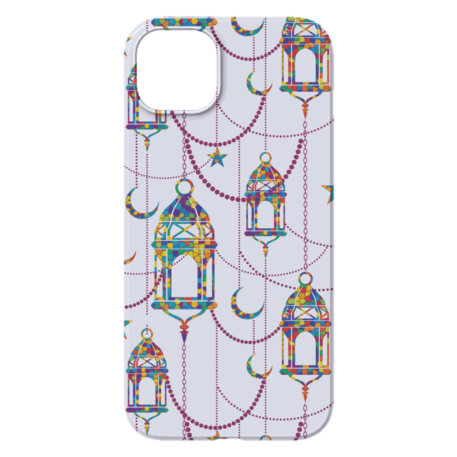 The design consists of brightly colored mosaic style lanterns with stars and moons hanging like chandeliers from chains. You'll find all sorts of colors including blue, green, yellow, and purple. We chose not to personalize the main design, however the default layout has your personalization at the bottom.