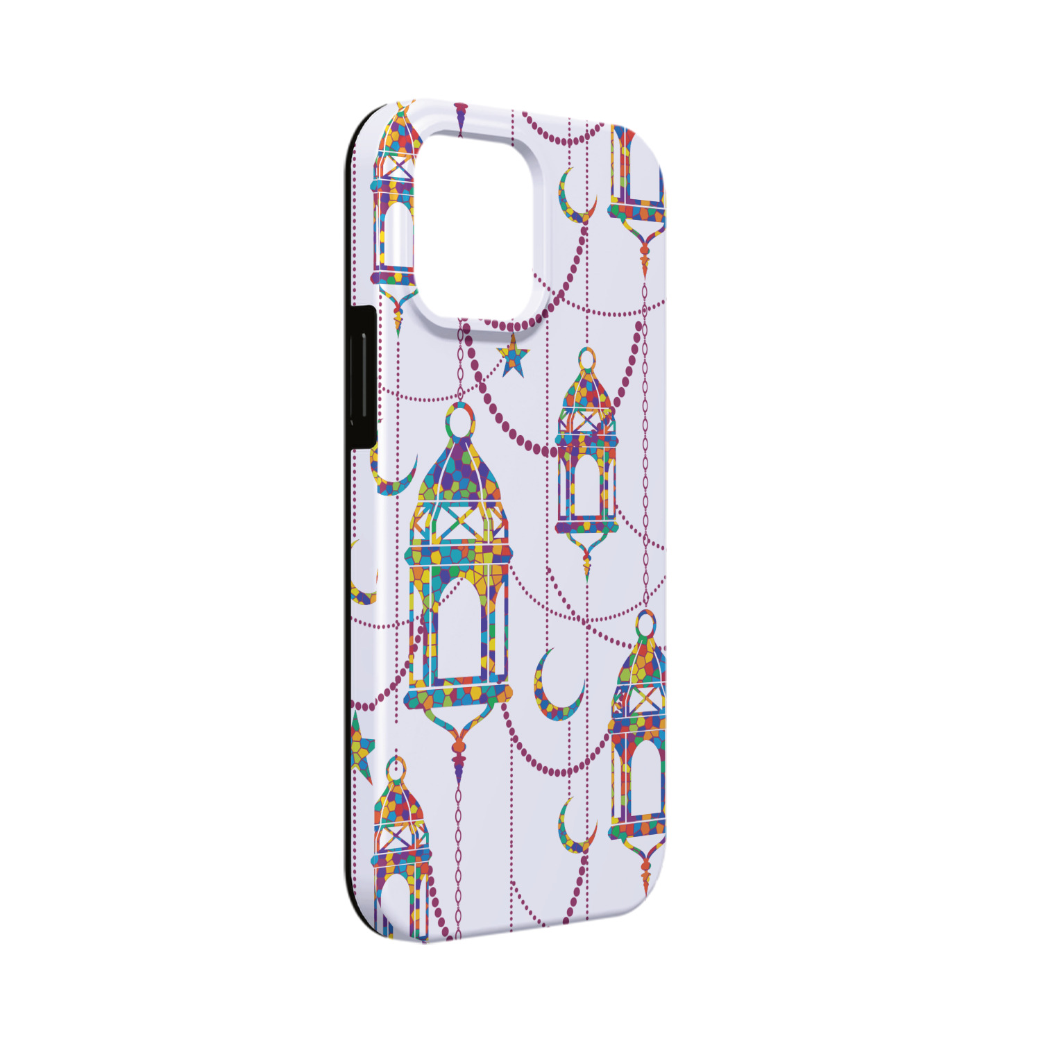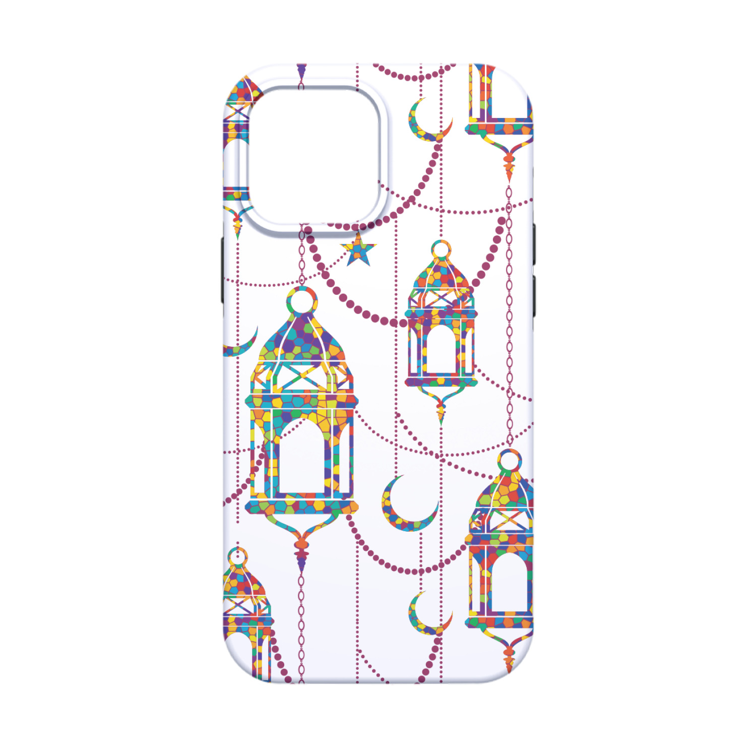 The design consists of brightly colored mosaic style lanterns with stars and moons hanging like chandeliers from chains. You'll find all sorts of colors including blue, green, yellow, and purple. We chose not to personalize the main design, however the default layout has your personalization at the bottom.