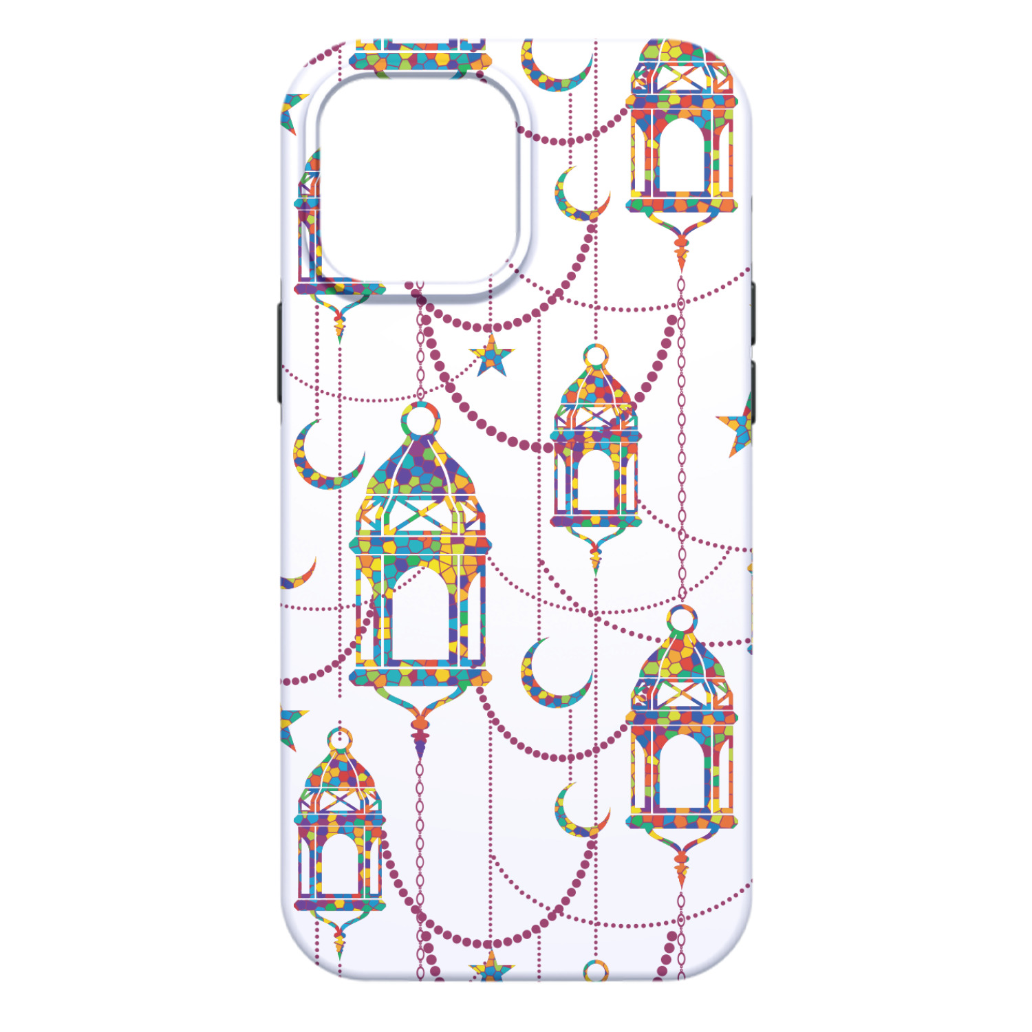 The design consists of brightly colored mosaic style lanterns with stars and moons hanging like chandeliers from chains. You'll find all sorts of colors including blue, green, yellow, and purple. We chose not to personalize the main design, however the default layout has your personalization at the bottom.