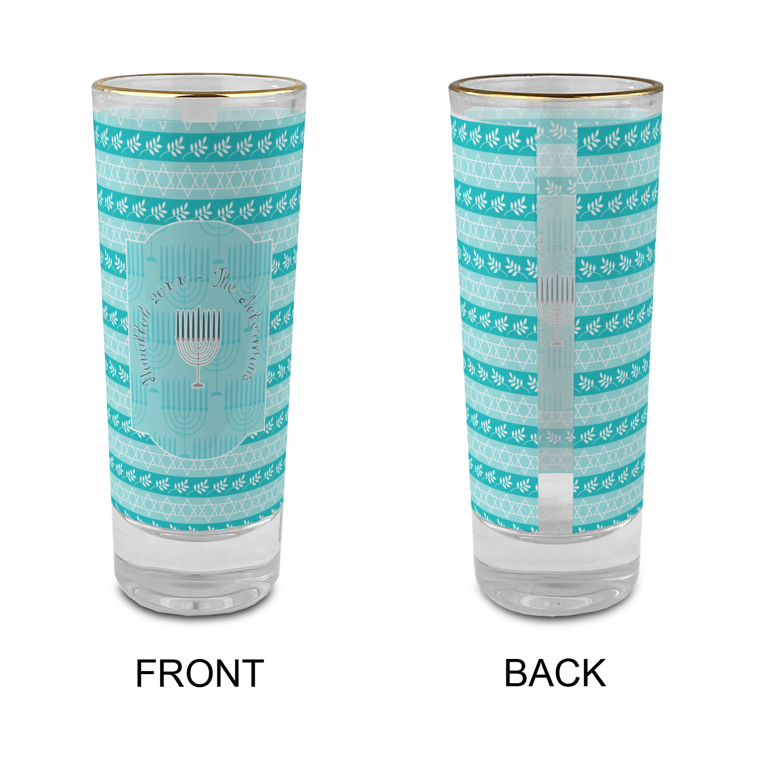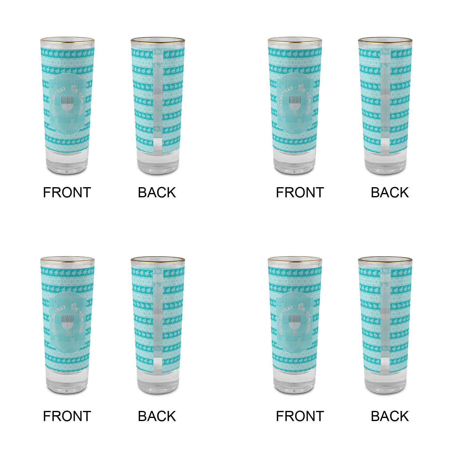 These glass shooter glasses are printed in full color with the design of your choice. These are a tall shooter 2 oz size and stand 4" tall. The print is a full wrap design to boldly display your personalization.