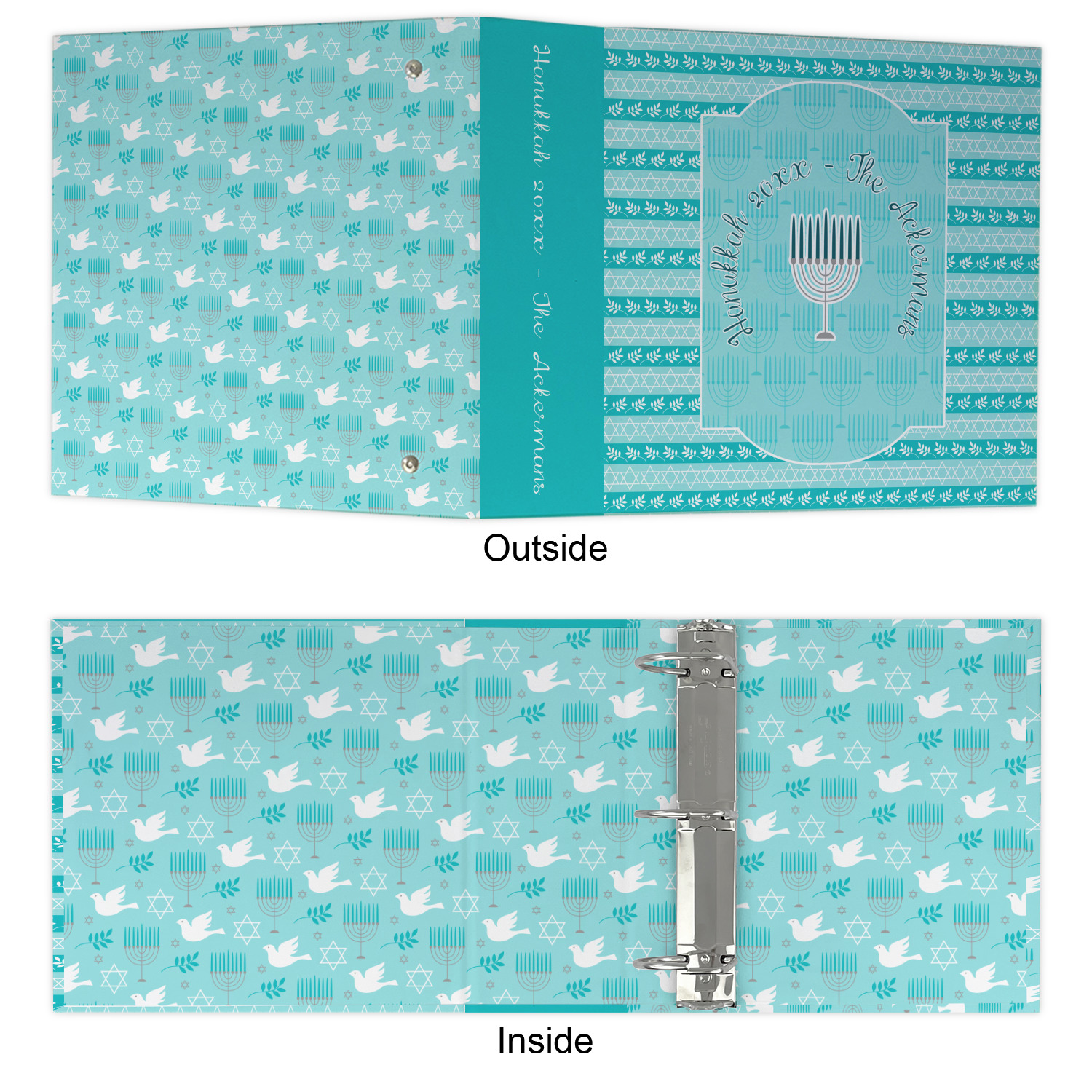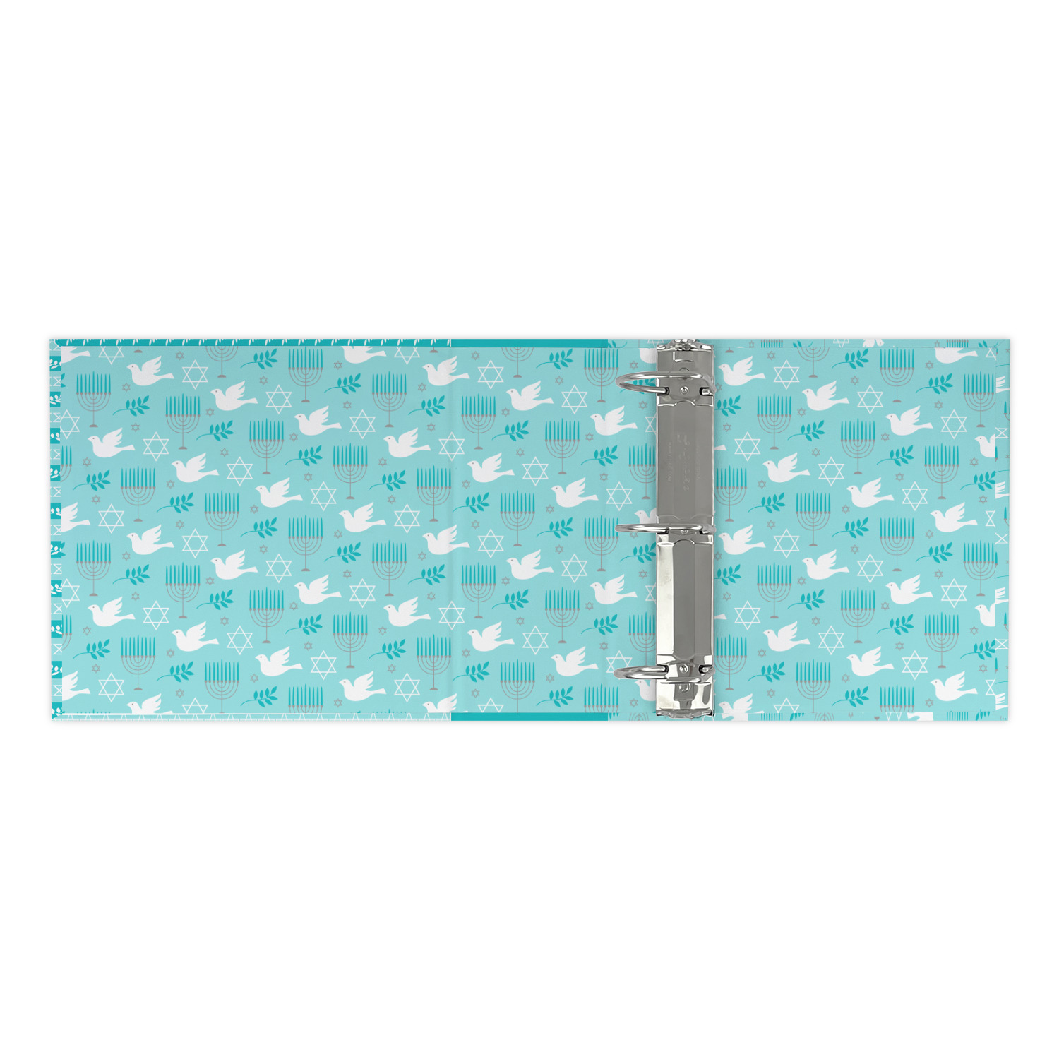 The design is a beautiful set of different shades of teal. You will see three different patterns used throughout this design. One with stripes, olive branches, and stars of David, one with menoras, and the last with doves, menoras, olive branches, and stars of David. The main design has a tall frame with your personalization and a menora graphic in the middle.
