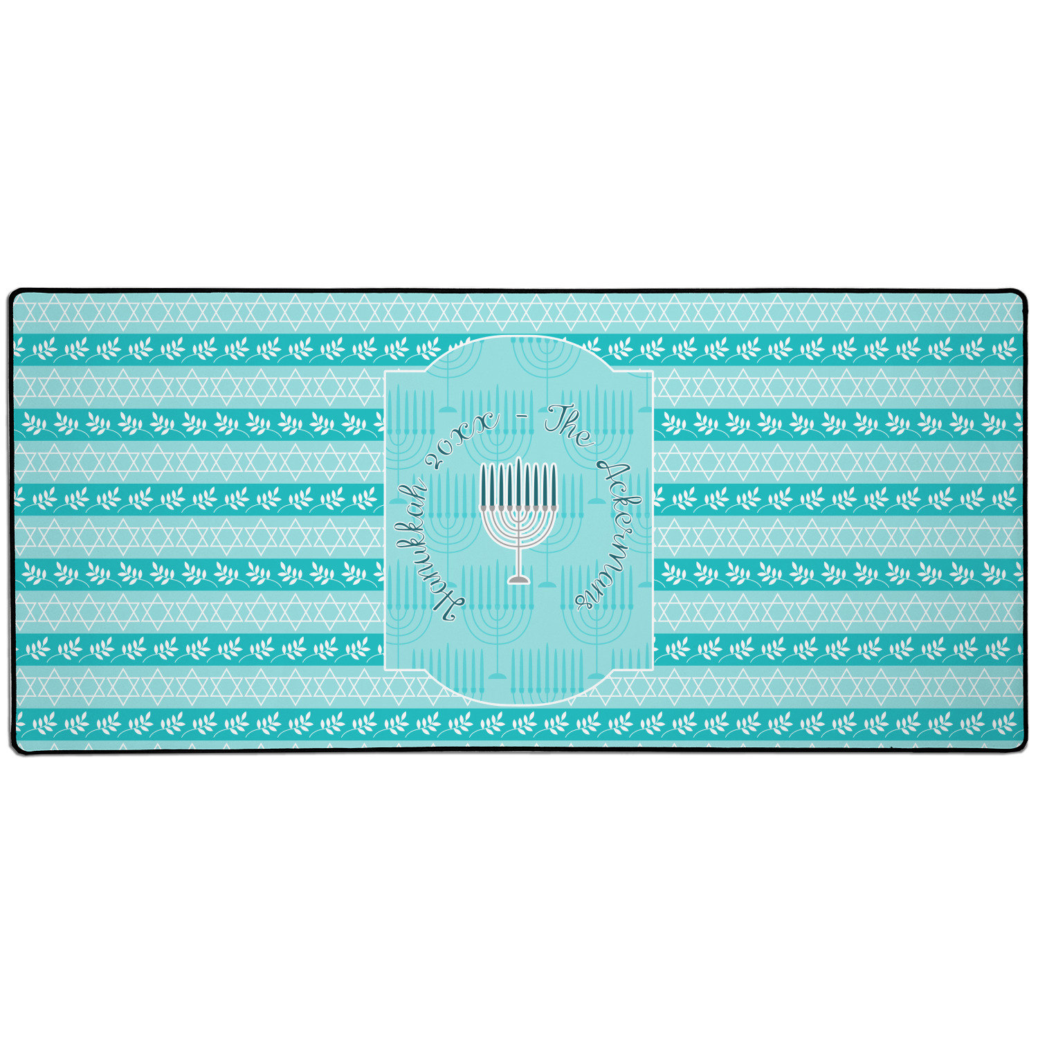 The design is a beautiful set of different shades of teal. You will see three different patterns used throughout this design. One with stripes, olive branches, and stars of David, one with menoras, and the last with doves, menoras, olive branches, and stars of David. The main design has a tall frame with your personalization and a menora graphic in the middle.