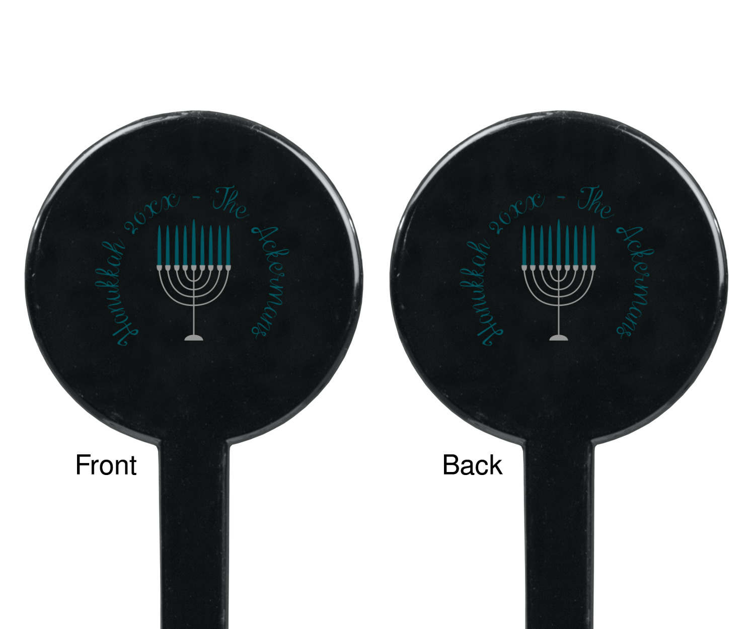 The design is a beautiful set of different shades of teal. You will see three different patterns used throughout this design. One with stripes, olive branches, and stars of David, one with menoras, and the last with doves, menoras, olive branches, and stars of David. The main design has a tall frame with your personalization and a menora graphic in the middle.